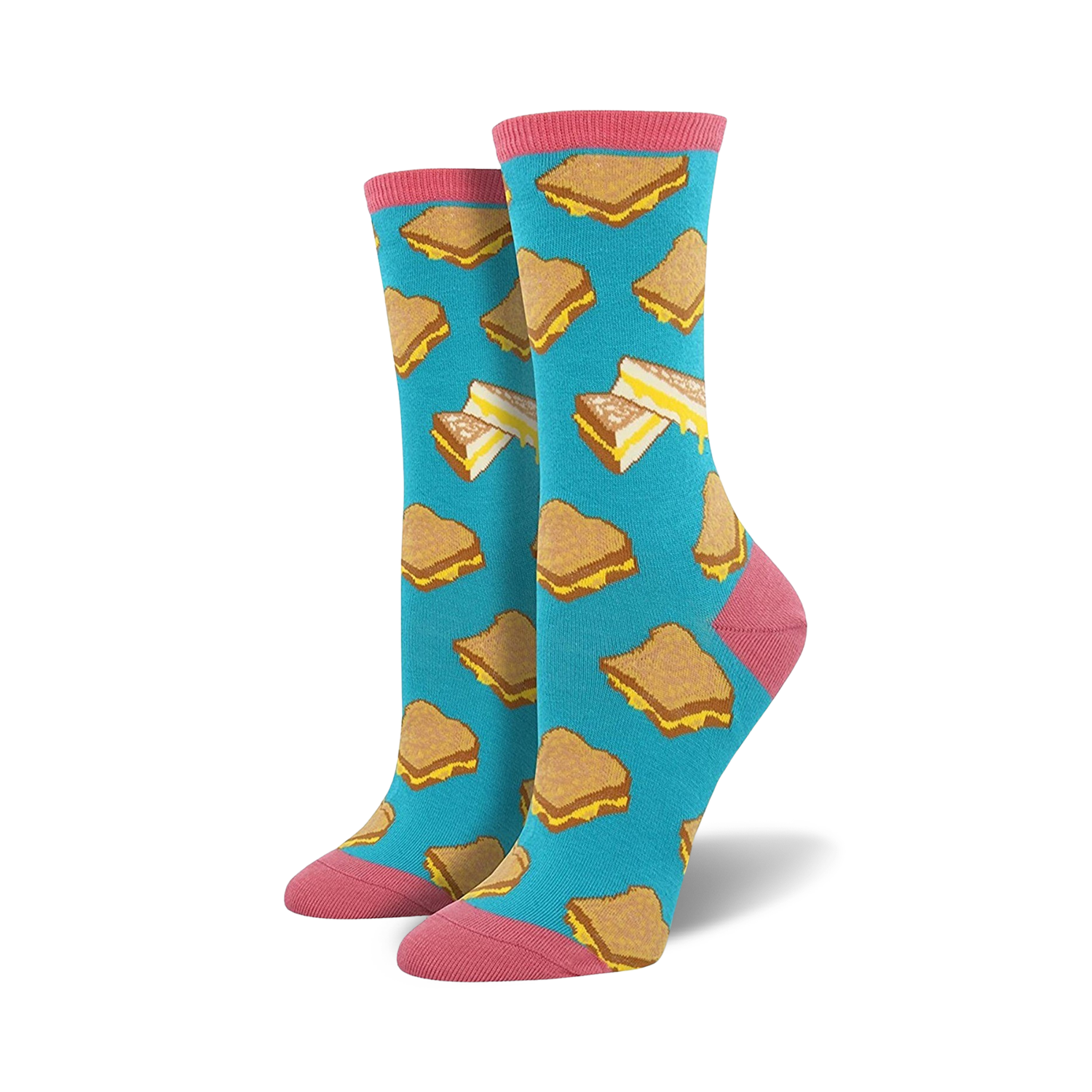 Who doesn't enjoy the warm, gooey goodness of a grilled cheese sandwich? Now you've got the perfect cheesy thing in you wardrobe to match your equally cheesy personality! Each fun pair of women's novelty crew socks features grilled cheese sandwiches printed all over on a teal blue background. The cuffs, heels, and toe lines are maroon. These awesome would be perfect to wear on National Grilled Cheese Day, which is April 12!