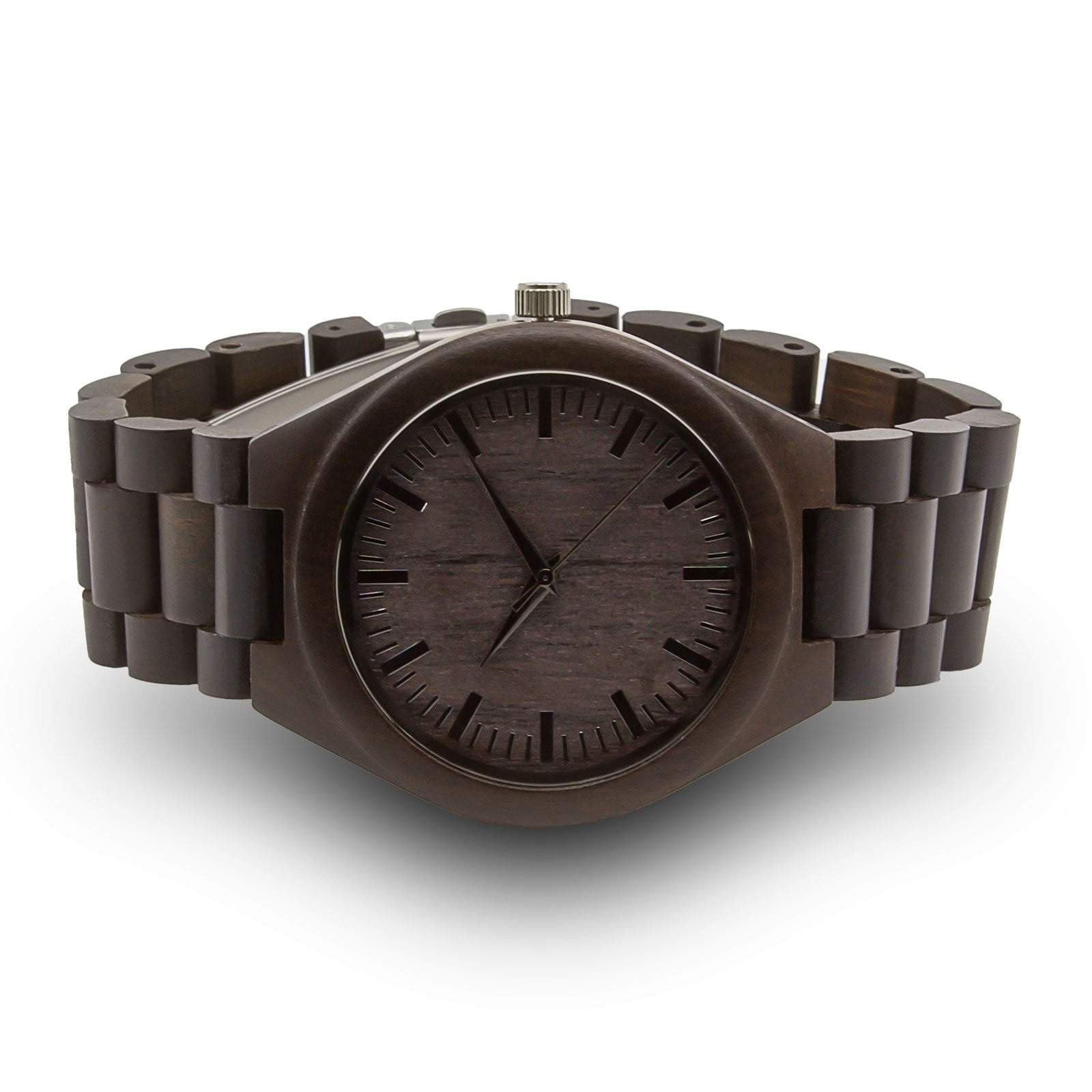 A fresh take on a classic wooden watch-our Grande watch is sure to take your daily looks to the next level. The band of the wood watch is a warm black shade made of black sandalwood. The look is completed with a wooden face and minimalist numbering inside. Engrave the back of the face to make this watch truly made for you!