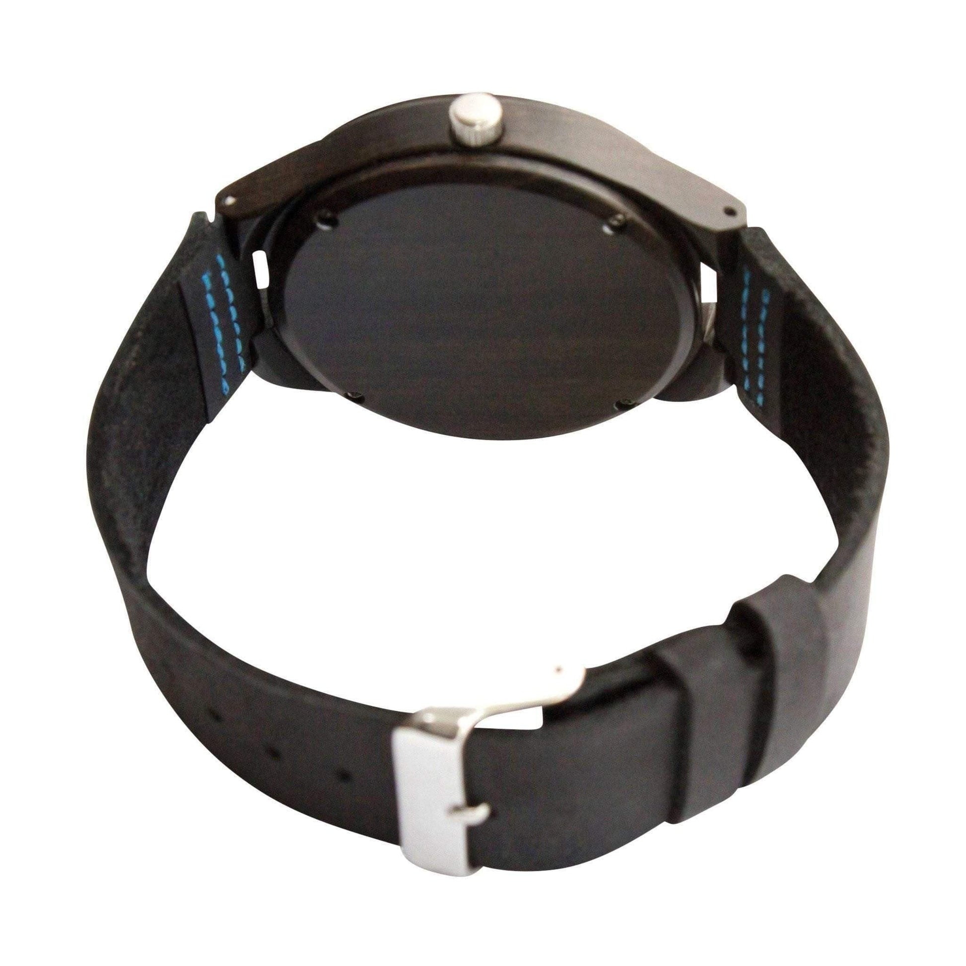 A stylish wooden watch, paired with a leather strap that features a brilliant brown tone, and paired with a charcoal black leather band. The dial showcases a simple and elegant look, that offers a dark shade, with matching hands; and a vibrant colored second dial, that matched the thread work done on the strap.