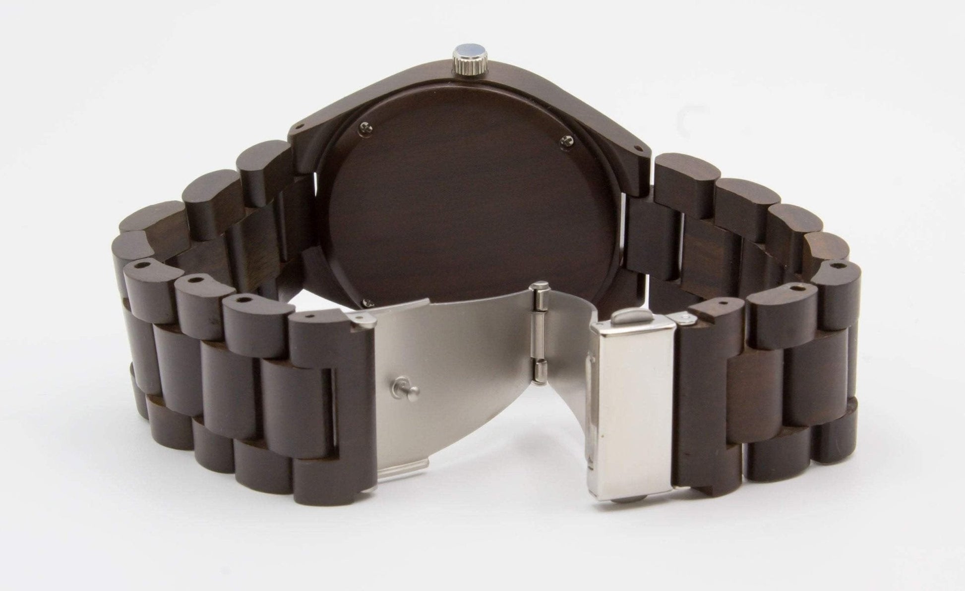 A fresh take on a classic wooden watch-our Grande watch is sure to take your daily looks to the next level. The band of the wood watch is a warm black shade made of black sandalwood. The look is completed with a wooden face and minimalist numbering inside. Engrave the back of the face to make this watch truly made for you!