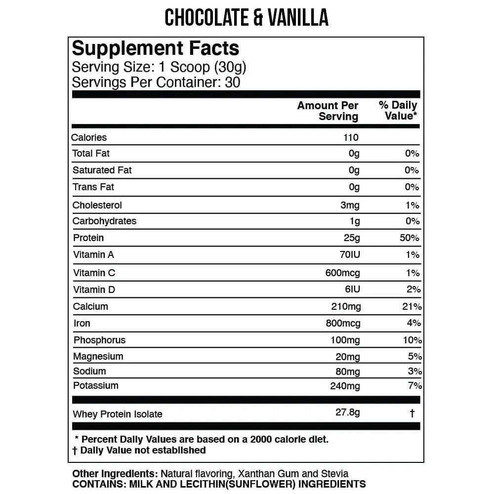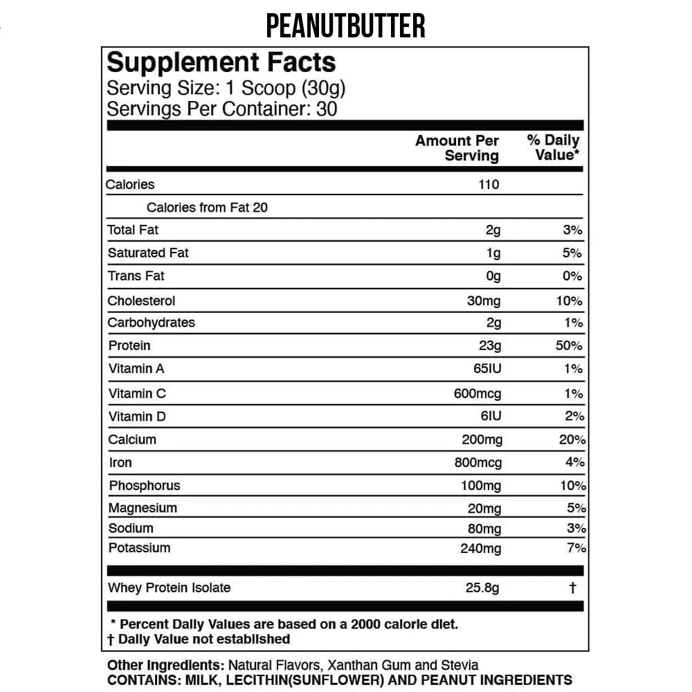 Whey isolate means our whey is "isolated" through micro filtration to almost totally pure protein at 25g of protein and over 6g of BCAA's per serving with no lactose, carbs or fats (Peanut Butter contains 23g of Protein, 2g fat and 2g carbs). Our unique protein formula contains only whey protein isolate and is not blended with lesser quality whey.