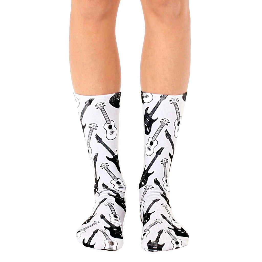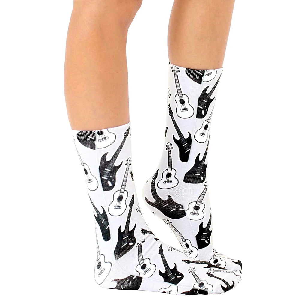 **Description:** Have you seen a guitar solo so sick it could shred the skin off your feet? Don't worry cause with our Guitar Crew Socks, you'll have your feet covered. These socks are strummin' with style and will have you hitting that high note on the fashion scale. Don't be a square, pick up a pair today!