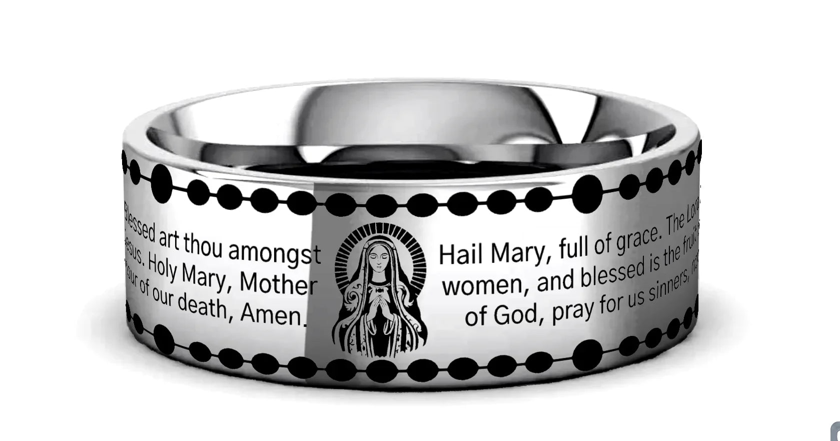 - Engraved elegantly along the outer surface, the Hail Mary prayer wraps around your finger like a whispered blessing. Each word etched into the metal carries the weight of centuries of devotion. As you wear this ring, you’ll feel a connection to the divine, a reminder of grace and hope.