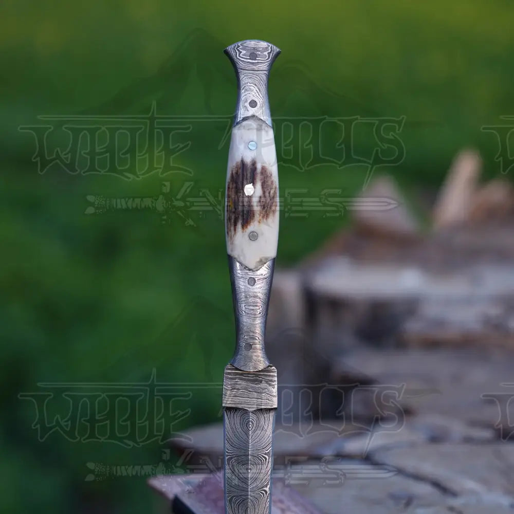 - Handle Material: Damascus steel front and rear bolster with stag antler
