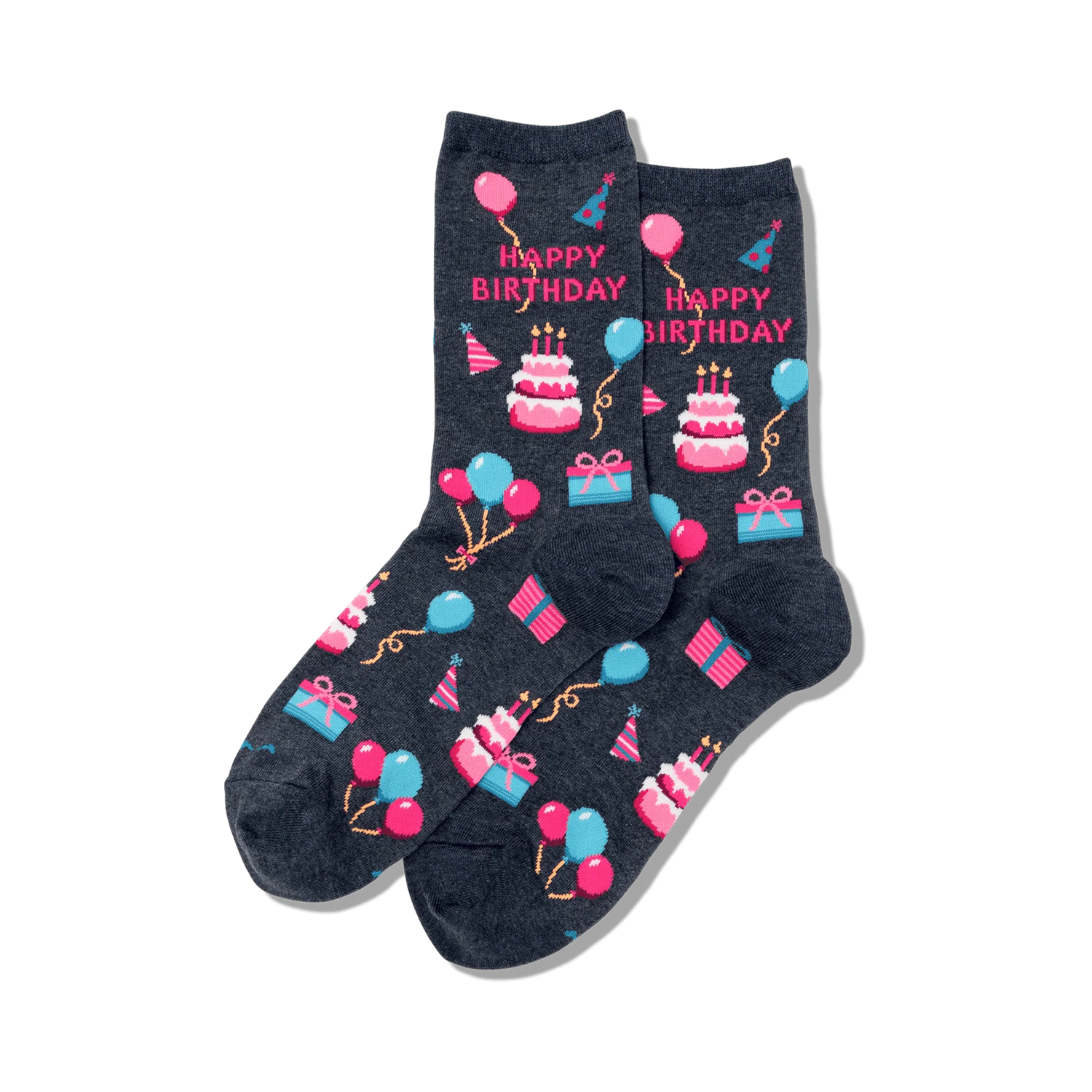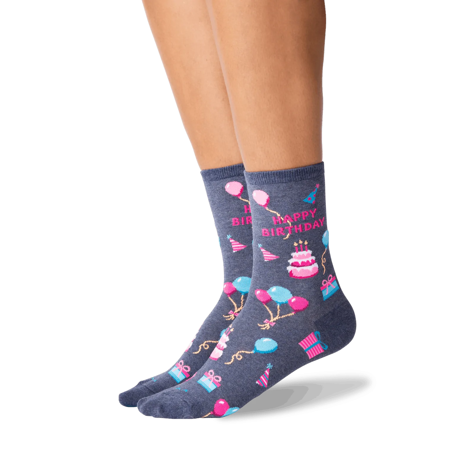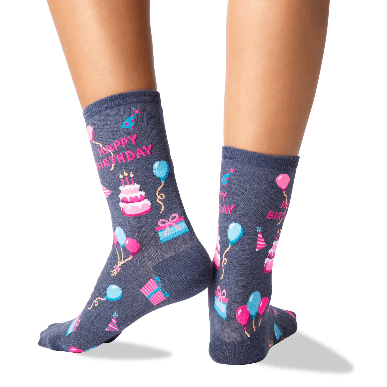 The Happy Birthday crew socks for women are a fun and lighthearted way to celebrate the special day. With a vibrant pattern of balloons, presents, party hats, and cakes, these socks will put a smile on your face and make sure everyone knows you're ready to party. And who knows, you might even get a few extra presents for wearing them!