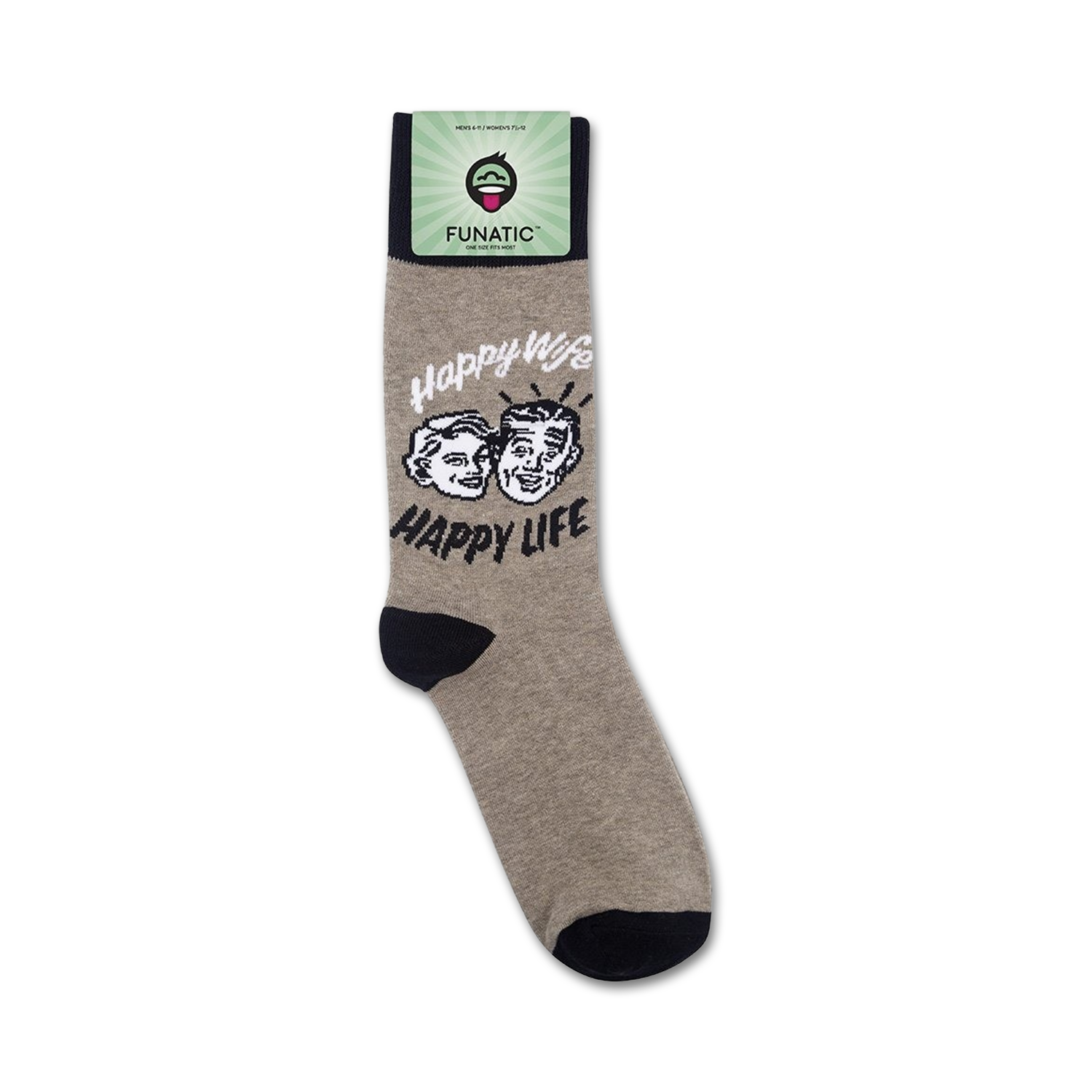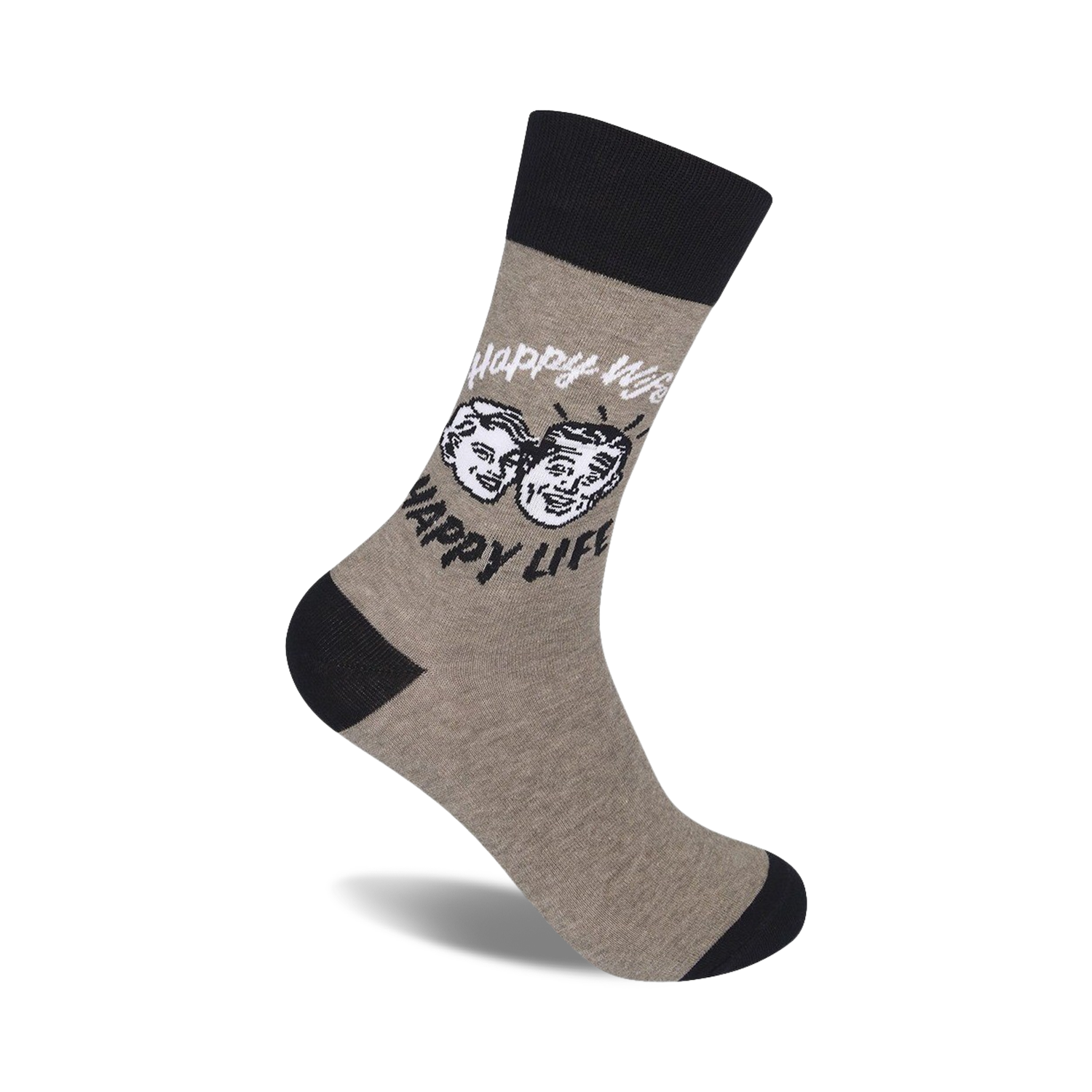 Looking for a witty way to show your love and devotion to your significant other? Slip into a pair of our Happy Wife, Happy Life crew socks, where you can tell the world how you feel. Your feet will be walking on sunshine with the picture of a smiling couple on the front of each sock, while the words "Happy Wife" and "Happy Life" stamped on each side make it crystal clear that you're one lucky guy!