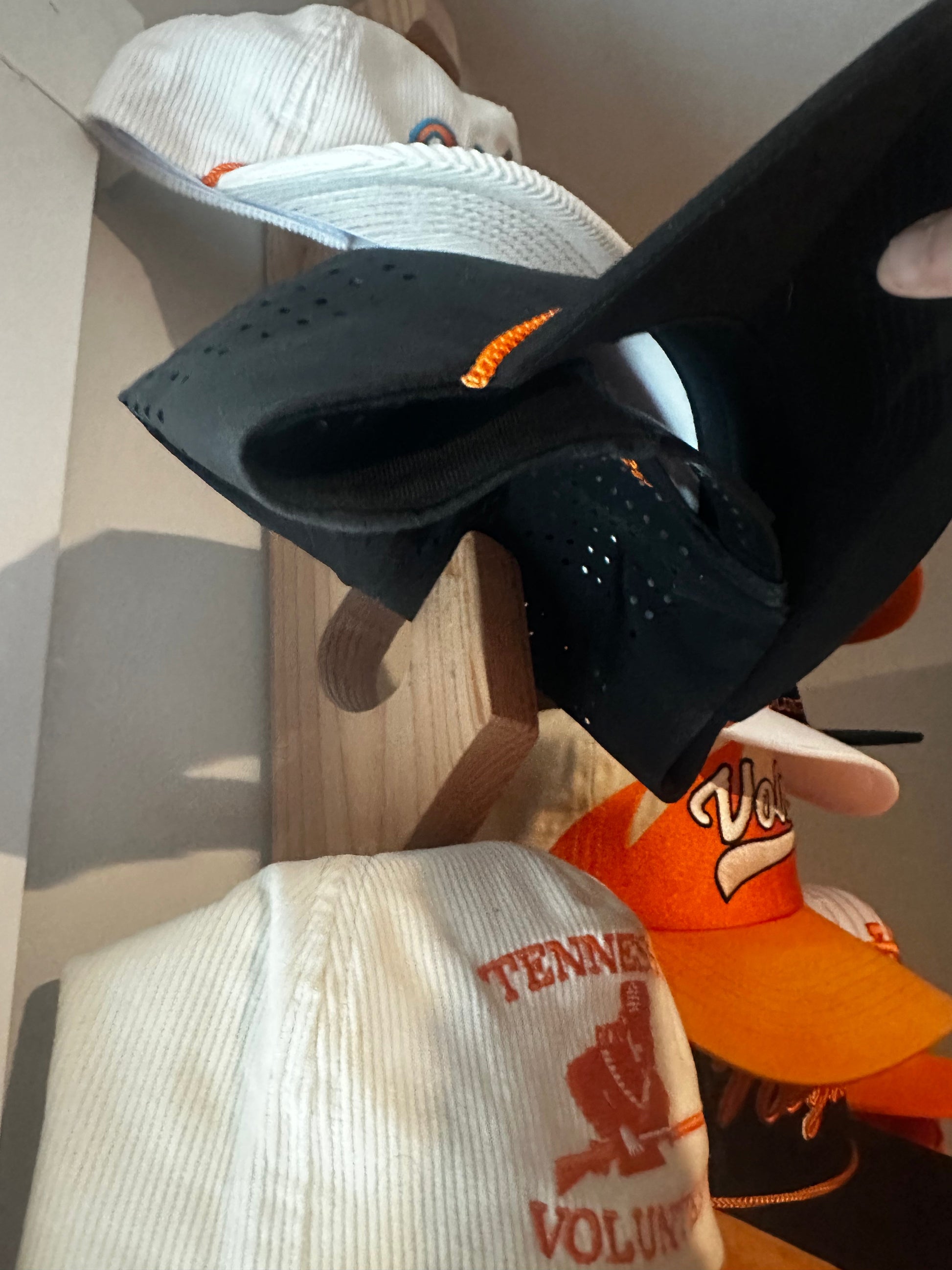 - You can fold hats to hang them like in picture three or can hang them by the strap.