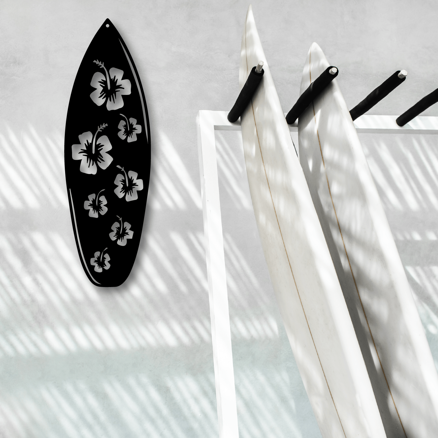 This Hawaiian Surfboard metal art piece is crafted from 16 gauge steel with a powder-coated finish for lasting durability. Its silhouette features a surfboard adorned with intricately cut Hawaiian-themed flowers, bringing a touch of island spirit and elegance to your decor. Perfect for adding a warm, tropical vibe to any space.
