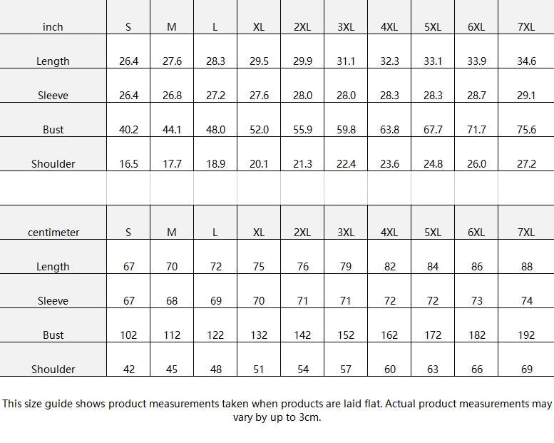 | centimeter | S | M | L | XL | 2XL | 3XL | 4XL | 5XL | 6XL | 7XL |