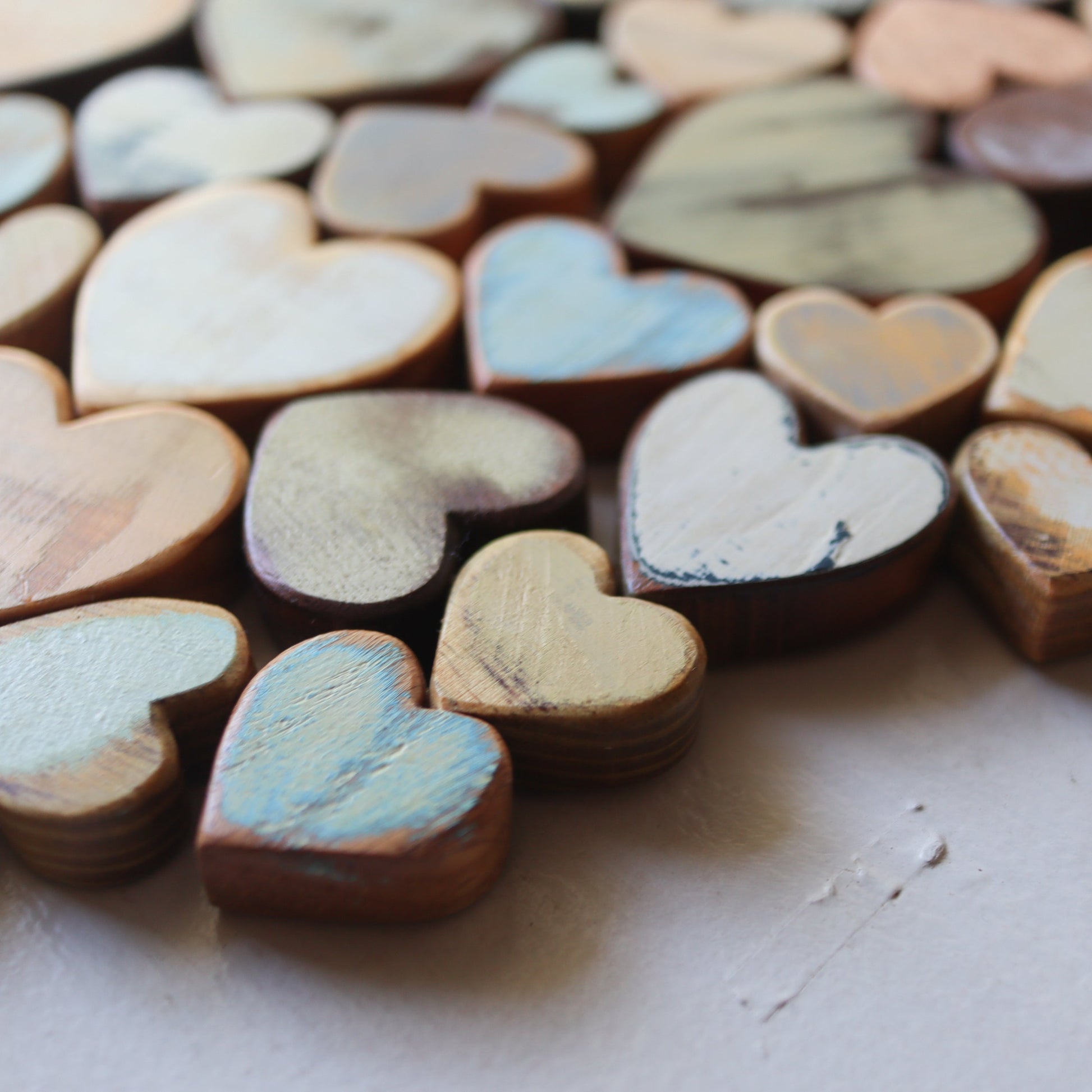 This artwork is handcrafted by assembling reclaimed wooden hearts of various sizes into one large heart—a meaningful one-of-a-kind find! The hearts range from 1 ½ to 3 inches wide, and the final Heart of Hearts Artwork is available in 20 x 20 or 30 x 30 inches.