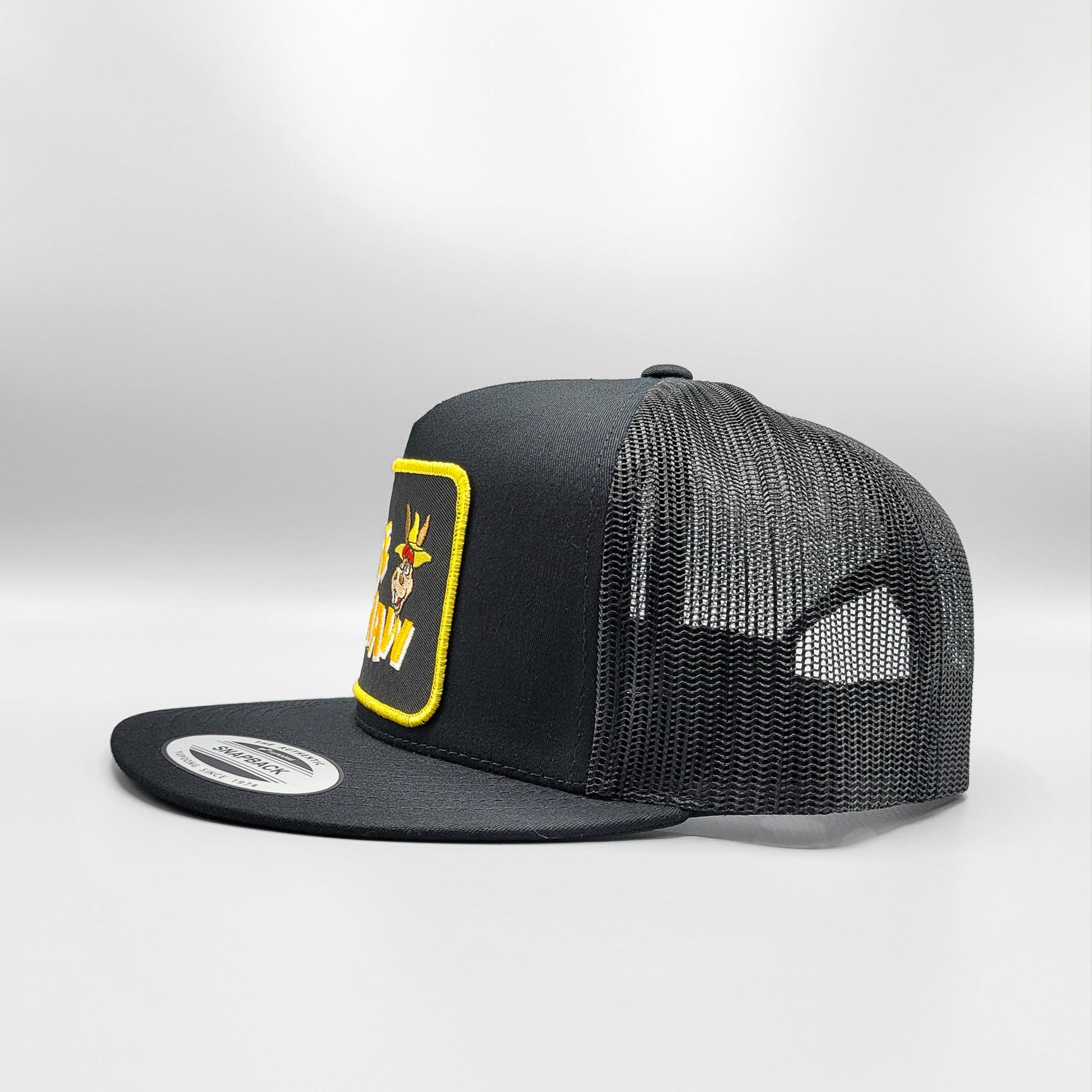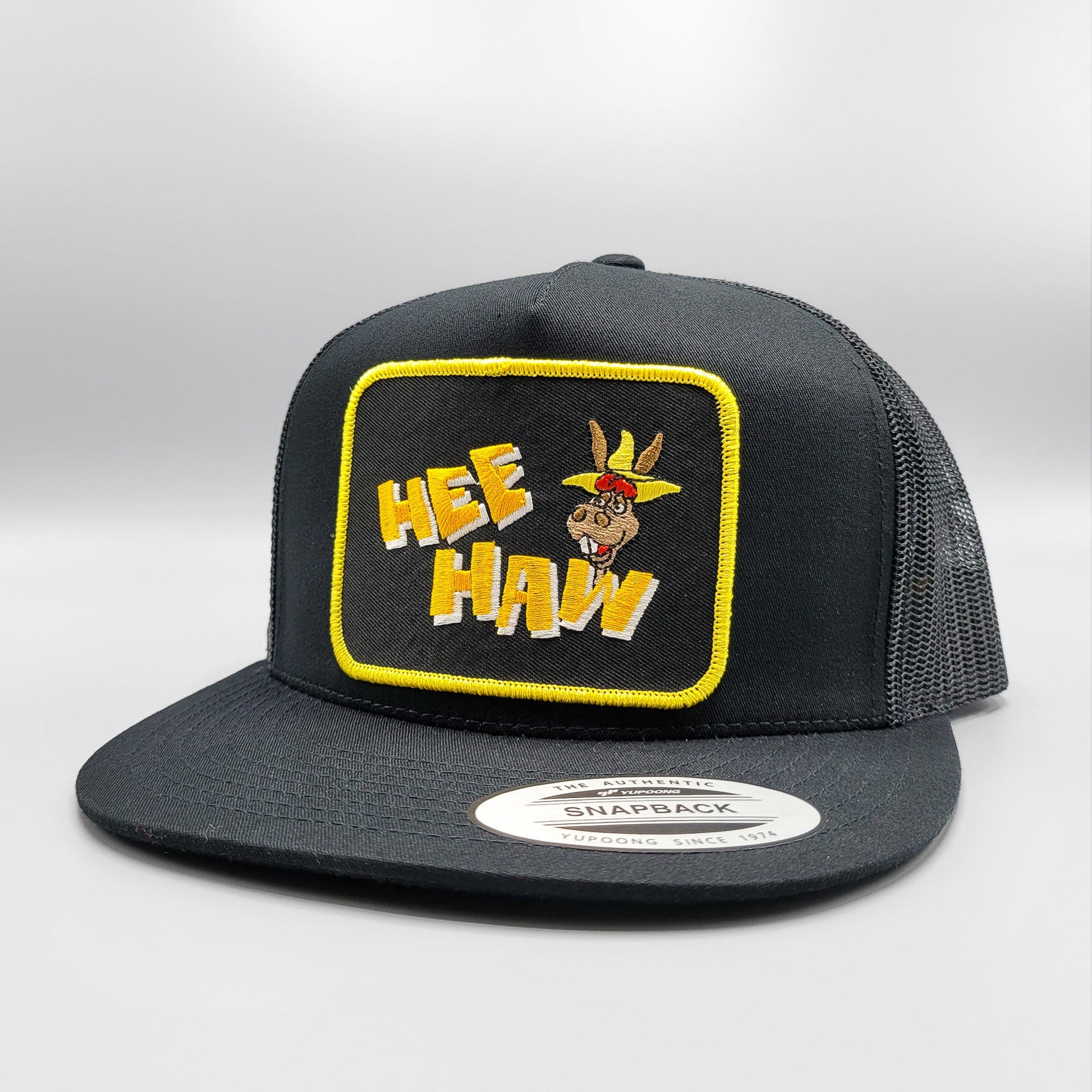 This Hee Haw trucker features a retro embroidered Hee Haw donkey logo patch from your favorite 80's tv show on an all black, premium Yupoong 6006 Classic high-crown mesh snapback baseball cap.