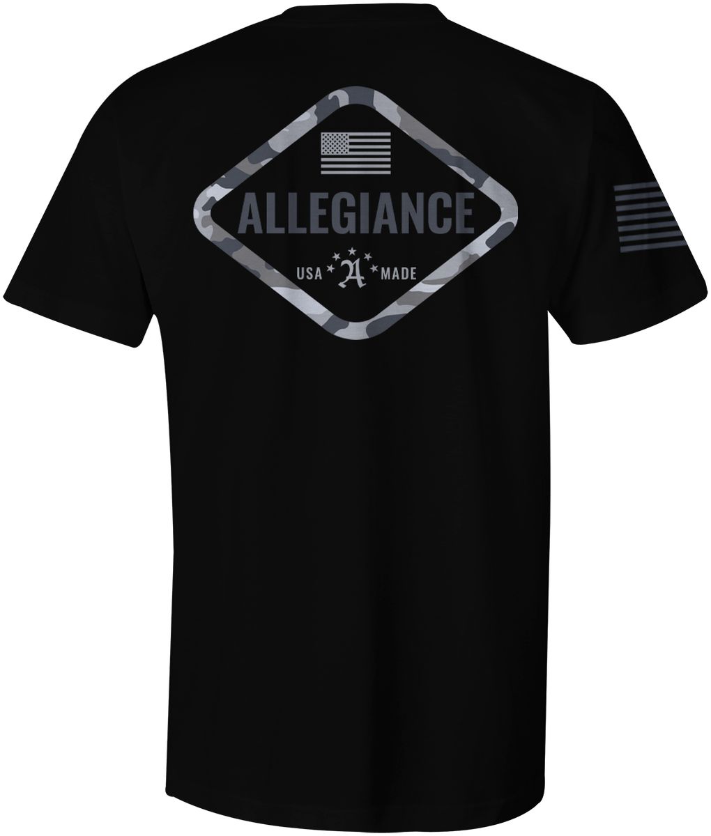 Stand out with the Allegiance Hex Camo Tee. This sleek and bold tee features a striking hexagonal design with the word "Allegiance" prominently displayed at the center. An American flag is proudly placed above, with the words "USA Made" below, symbolizing your dedication to quality and patriotism. The design is printed large on the back and small on the front, with an American flag on the sleeve, giving this shirt a powerful and unified look. Crafted with precision, the Hex Camo Tee is perfect for those who value style and substance. Whether you're on the go, hitting the gym, or just enjoying a casual day out, this tee has you covered. Embrace the blend of durability and comfort that defines Allegiance apparel and make a statement wherever you go. Designed and printed in the United States.