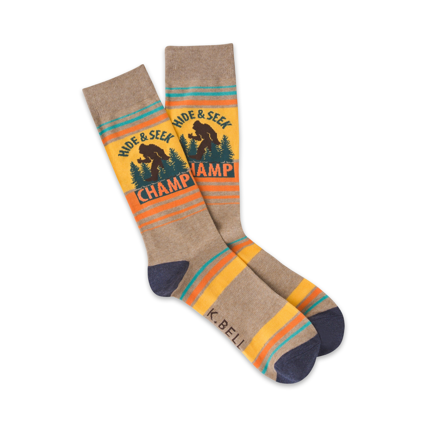 Hide & Seek Champ socks: Where legendary games of hide & seek come alive! These brown crew socks feature a colorful pattern of Bigfoot, the hide and seek champ, and the words 'Hide & Seek Champ' are written on the socks. If you're a fan of fun, unique socks that are sure to bring a smile to your face, then these socks are for you. You might even find yourself becoming a hide and seek champ yourself!