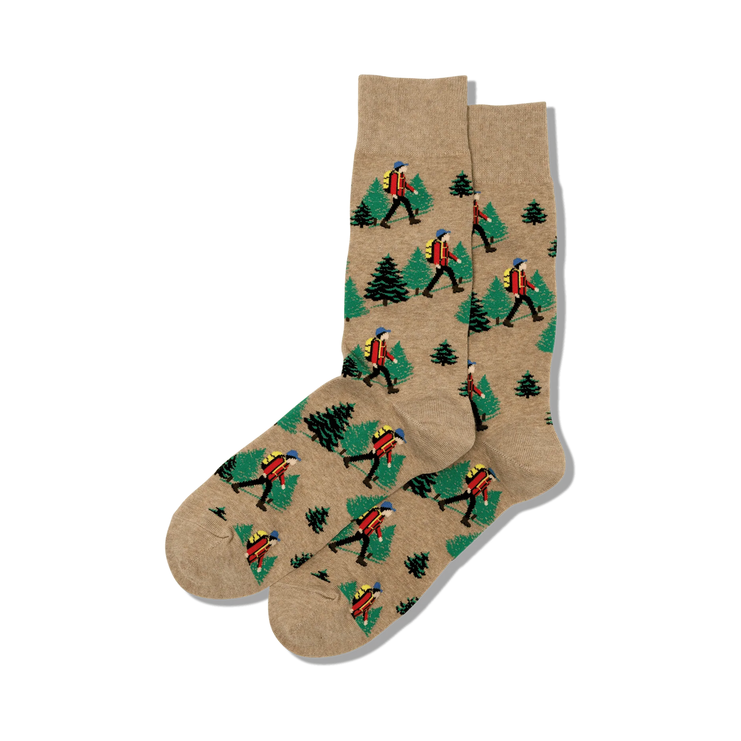 Hike up your style with our Hiker Crew Socks! These brown socks feature a vibrant pattern of a hiker exploring lush green pine forests. Don your pair of hiker socks for rugged resilience and happy trails.
