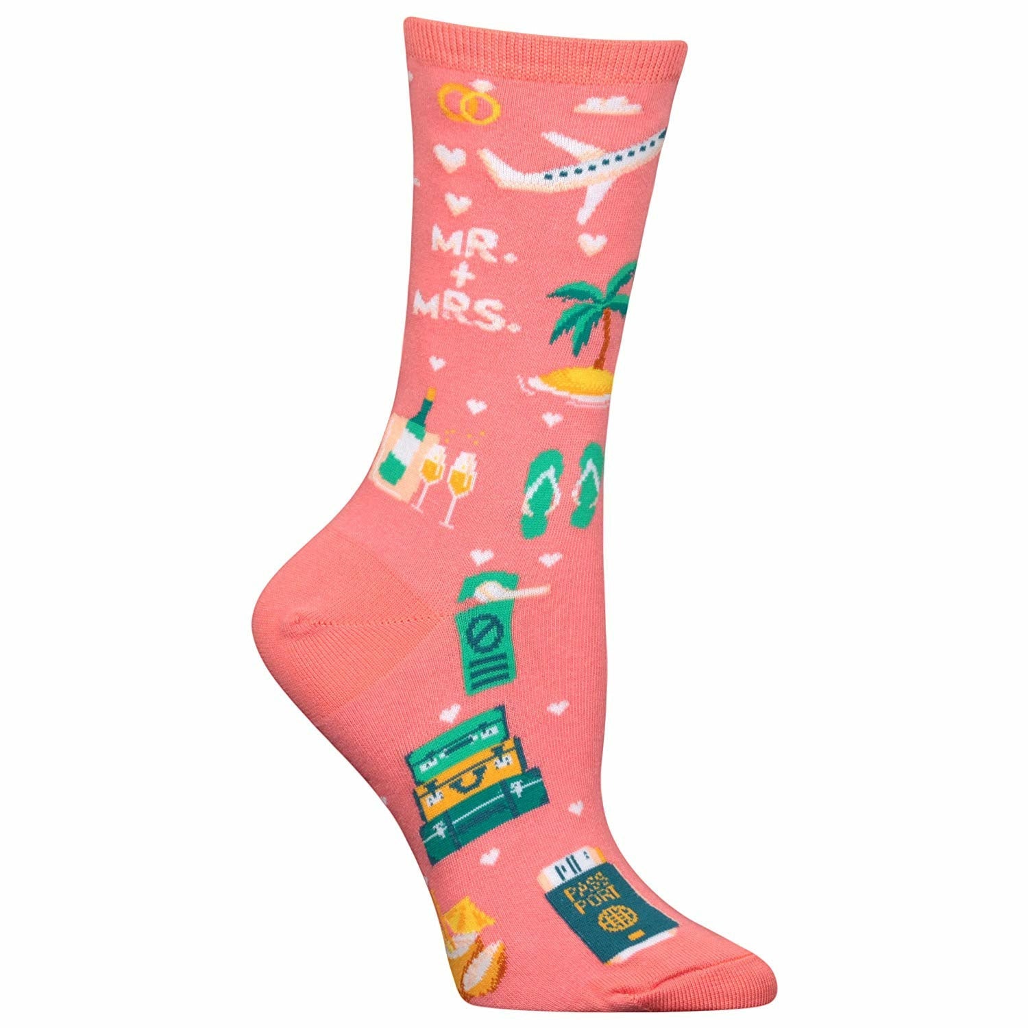 These 'Honeymoon' socks are a coral pink. The visible portion shows a fun pattern of honeymoon-themed images: a plane, a tropical island, flip-flops, champagne glasses, wedding rings, and what looks like a passport and suitcase. Small white hearts are scattered throughout the design. They're crew socks, shown from the side, so you can see the shape and detailing clearly. A fun, lighthearted way to celebrate your trip!
