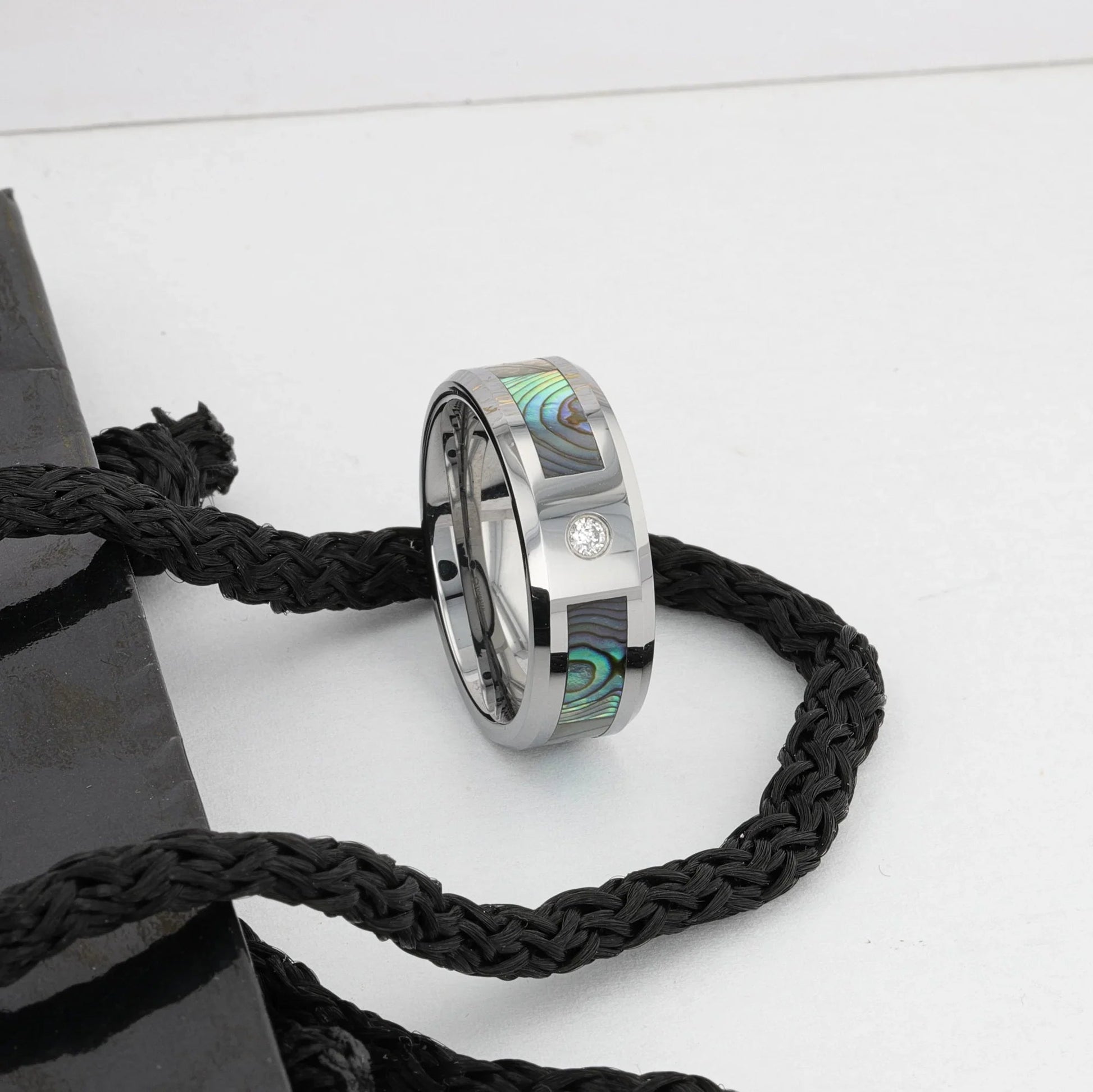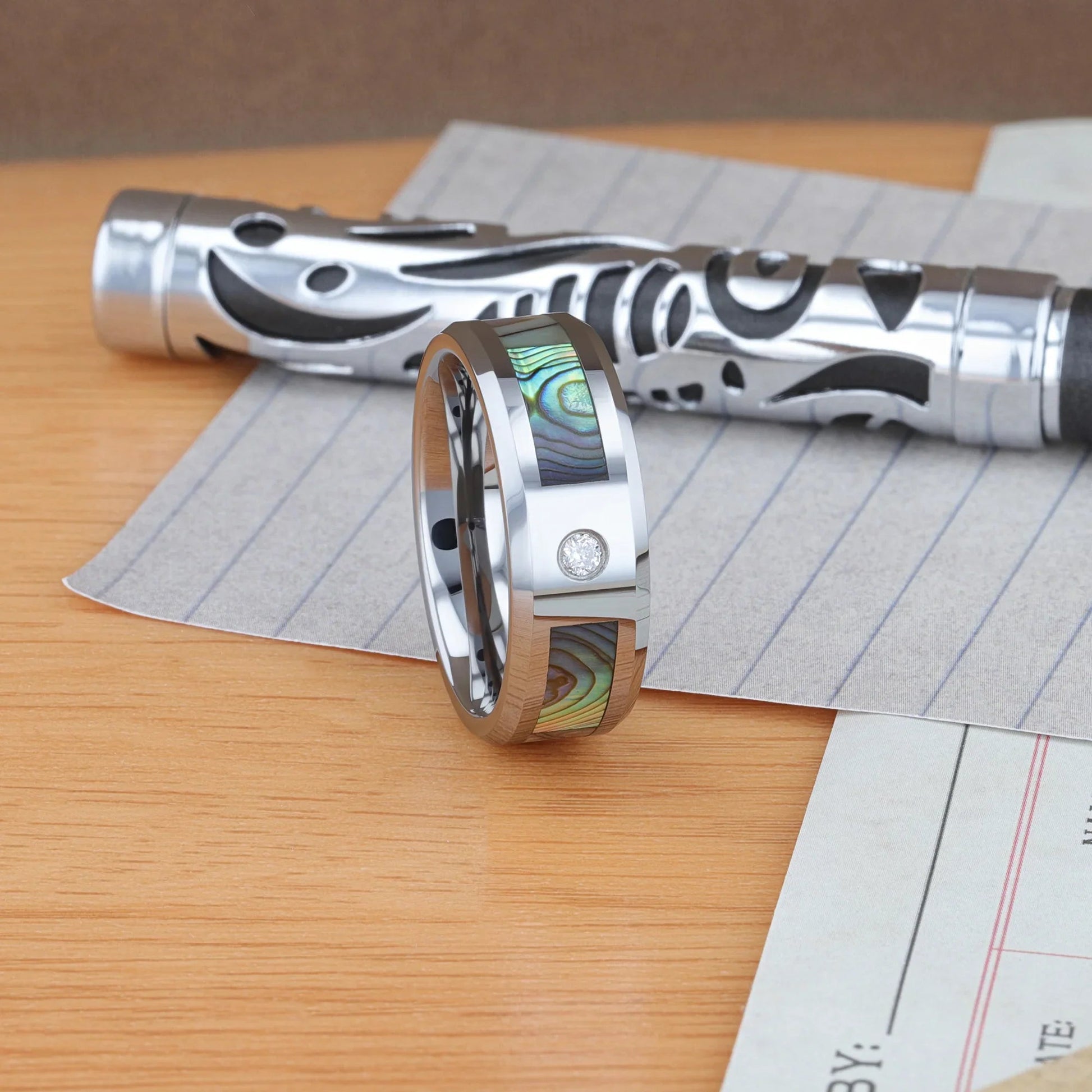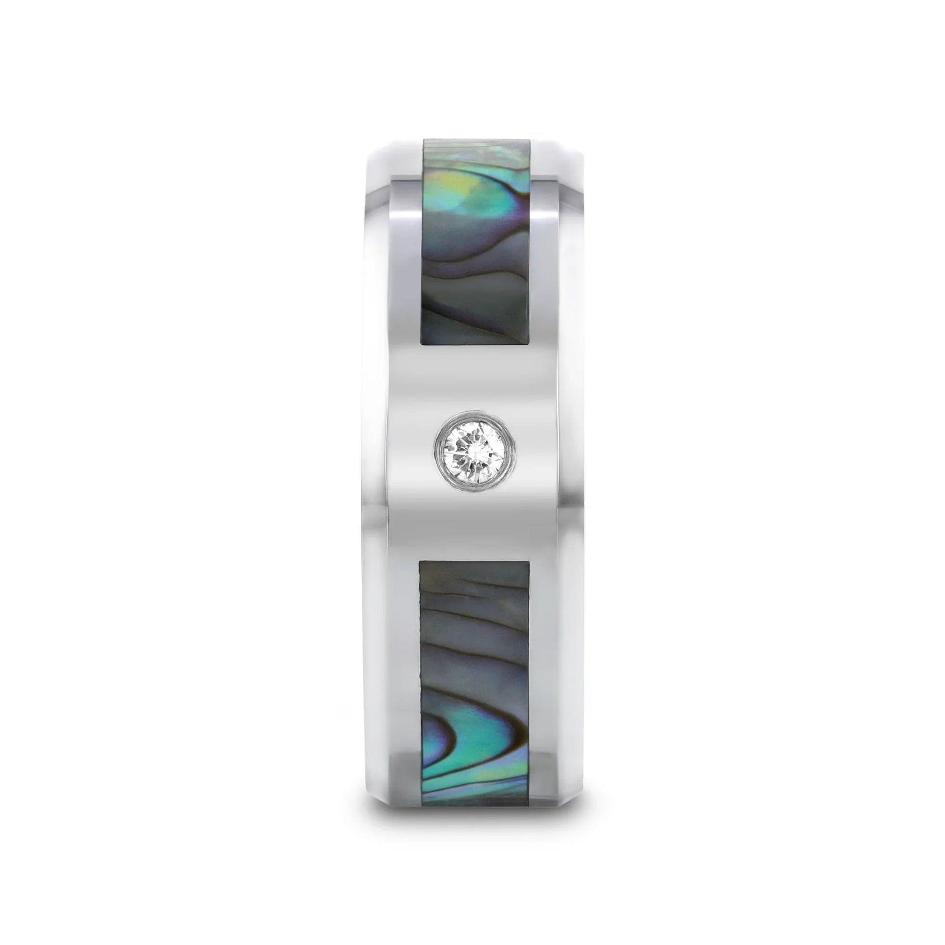 HONOLULU Mother of Pearl Inlay Tungsten Carbide Ring with Beveled Edges and White Diamond - 8mm