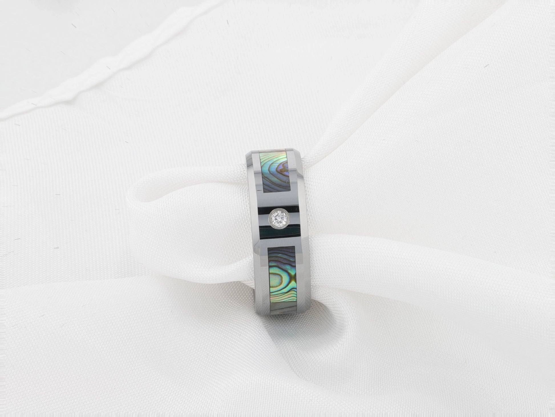 This beautiful Tungsten Carbide ring by Thorsten features a Mother-of-Pearl inlay displaying iridescent purple, blue, green, white, and black swirls like the shimmering waves in the ocean. Made from the inside lining of oyster and abalone shells, Mother-of-Pearl is a decorative material that has been used for centuries for furniture, musical instruments, and jewelry. If that weren’t enough, this beautiful ring also features a classic 0.06 carat round cut white diamond with a color I and clarity of I1.