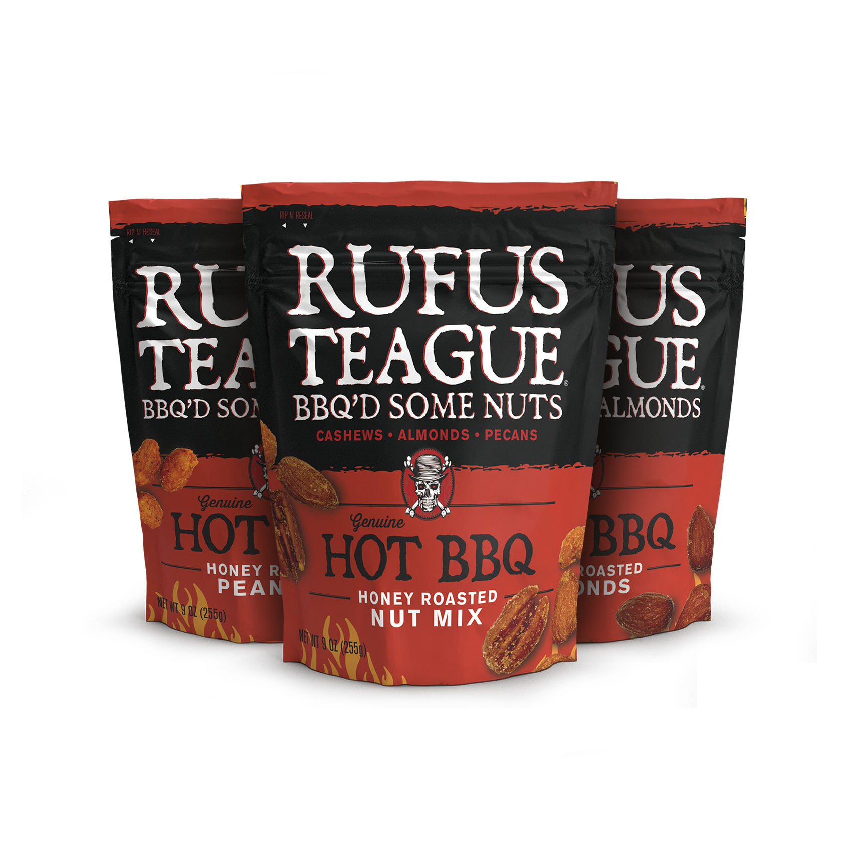 FIRE IT UP! Get all THREE varieties of Genuine Hot BBQ Nuts. All are honey roasted and coated in Rufus’ legendary Blazin' Hot BBQ goodness. Each comes in a stay-fresh pouch that’s resealable, as long as you can force yourself to stop eating long enough to zip it.