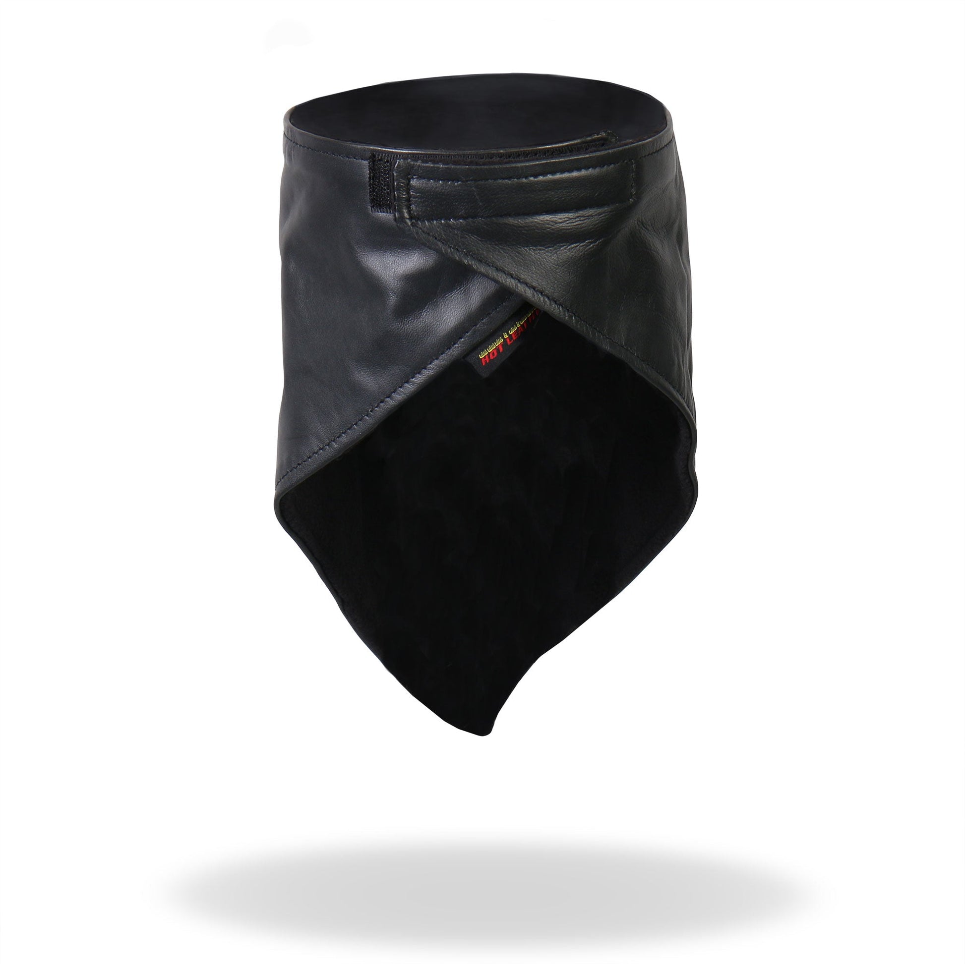 A black leather bandana style neck warmer with fleece lining, great for cold weather riding and winter sports!. This unisex, one size fits all soft neck warmer also contains a Velcro closure. Ride easy wearing this sleek neck warmer and represent the bik