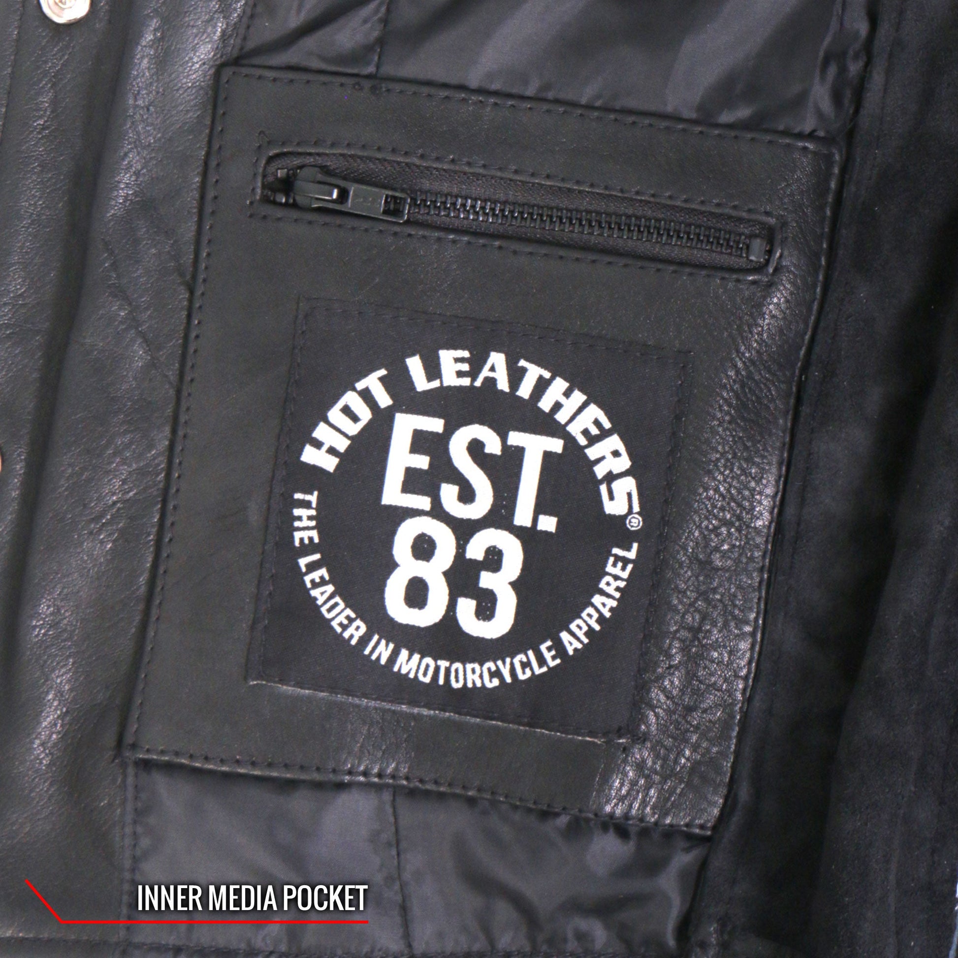 Front V-Neck and 4 snap front. It has front zippered convenience pockets ,inner extra large gun pocket, and a zippered media lipstick pocket .The lining is Hot leathers original art . The side panels offer extra room if necessary , and are tied with the same premium naked leather laces. Best quality inside and out on this vest. Order true to size