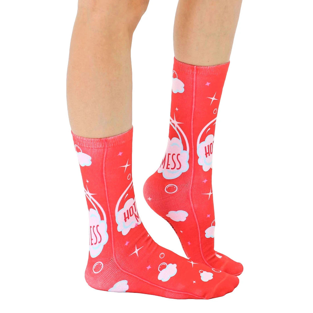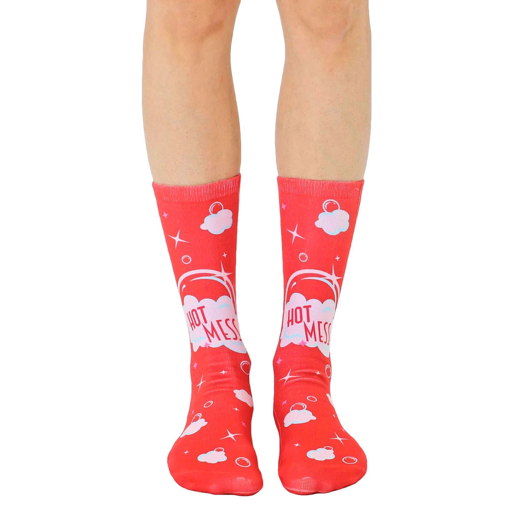 These Hot Mess socks are the perfect way to show off your fun and carefree personality. With their bright red color, white clouds, pink stars, and "Hot Mess" speech bubble, these socks are sure to turn heads wherever you go. Plus, they're made with a soft, breathable fabric that will keep your feet comfortable all day long. Did you know clouds are made of tiny ice crystals or water droplets? Wear these socks on your next adventure and find out if someone notices!