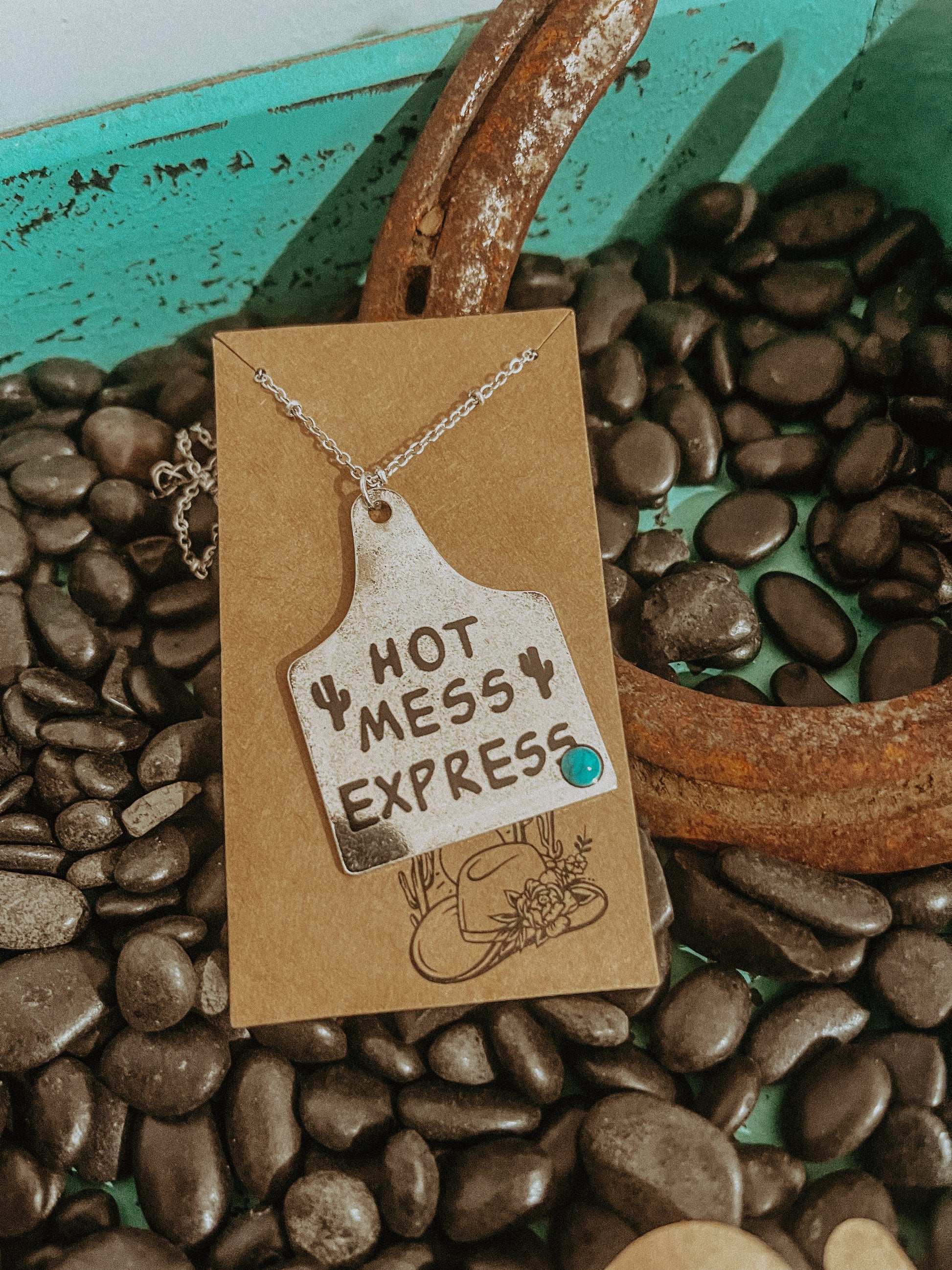 Unleash your wild side with the Hot Mess Express Necklace! Featuring a playful bull ear tag pendant, this statement piece is perfect for those who embrace their chaos. Get ready to turn heads and show off your unique style with this quirky accessory.