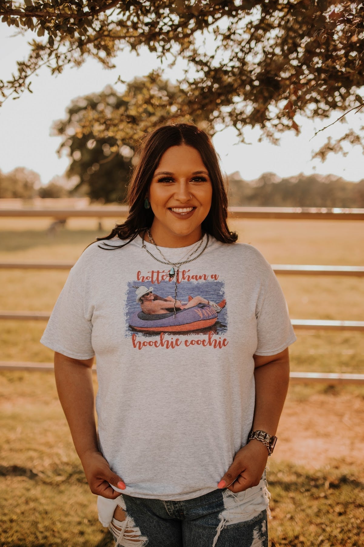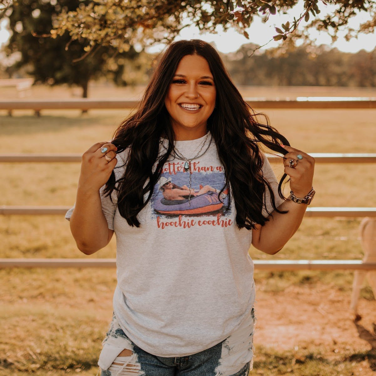 Need a cute top to hang down by the river on a Friday night? Then our Hotter Than a Hoochie Coochie Tee is the perfect way to spice up your wardrobe! Pair this trendy graphic tee with your favorite jeans and jewelry for a fun look.