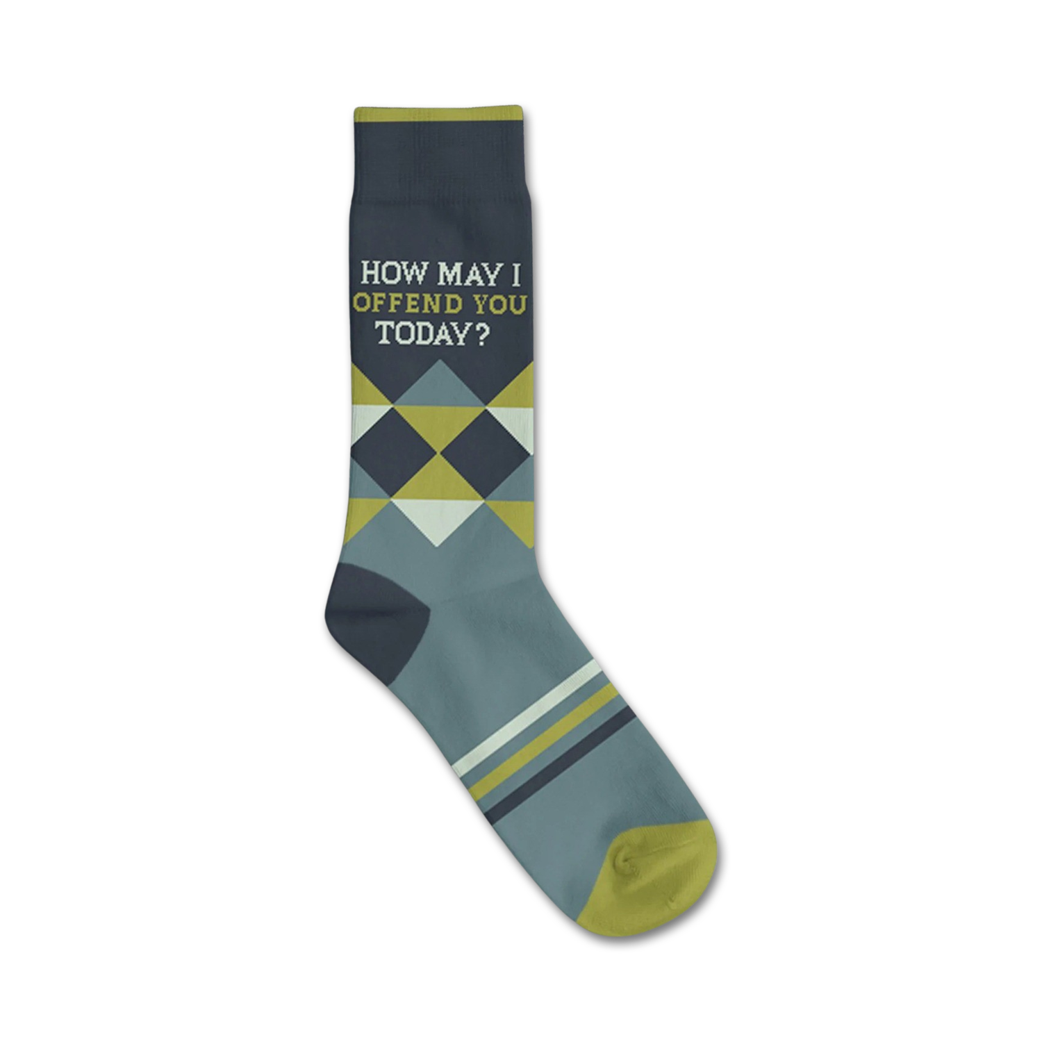 How May I Offend You Today?! Do you have a knack for being sassy and salty? Well, you need these socks in your life! Show off your spicy spirit with this crew sock featuring a zesty green, yellow, and white geometric pattern. The secret ingredient to any outfit is a dash of sass, don't you think?