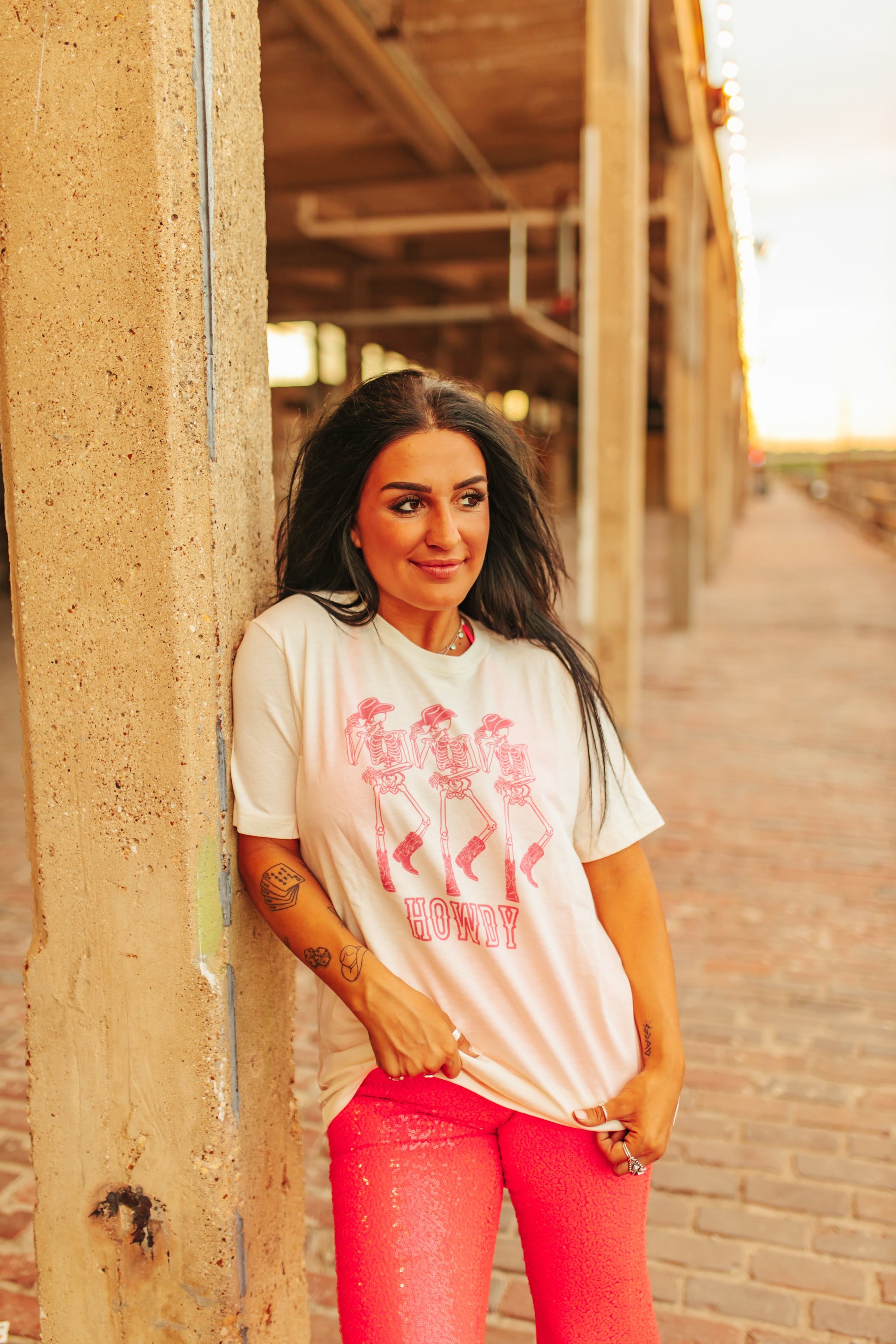 Looking for a western-inspired graphic to add to your t-shirt collection? We’ve got you covered with our Howdy Dancing Skeletons Graphic Tee. This fun graphic tee features pink skeleton cowboys with cowboy hats and boots. Throw on your favorite pair of cowgirl boots for a casual cowgirl fit!