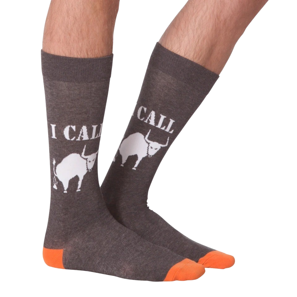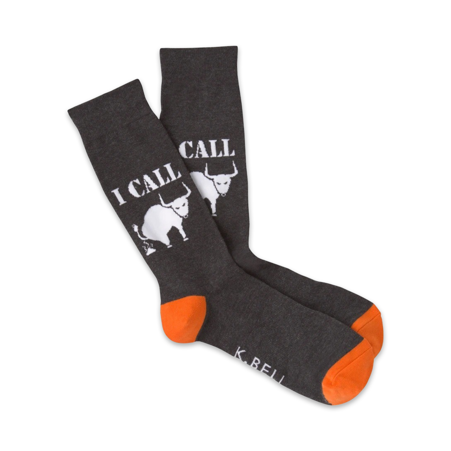 There is nothing wrong with calling out BS when you see it or hear it, especially today. I think others rely on us truth seekers! These funny black and orange crew socks will call your bluff with the implied phrase "I call bullshit" above the ankle. Complete with squatting bull and poop pile.