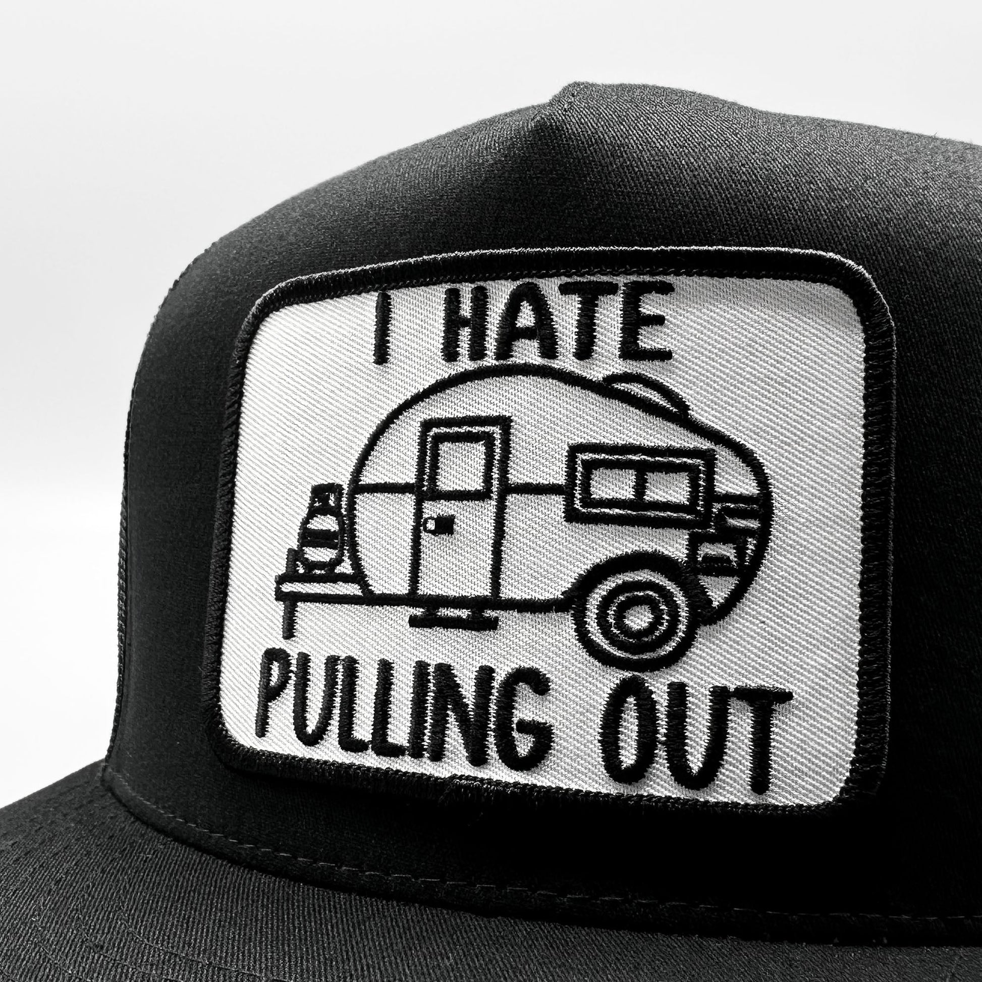 This funny "I Hate Pulling Out" trucker hat features an adult humor retro RV Camper embroidered patch on an all black, premium Yupoong 6006 Classic high-crown mesh snapback baseball cap. This is the perfect gift for the RV, truck camper, Airstream or van-life enthusiast in your life.