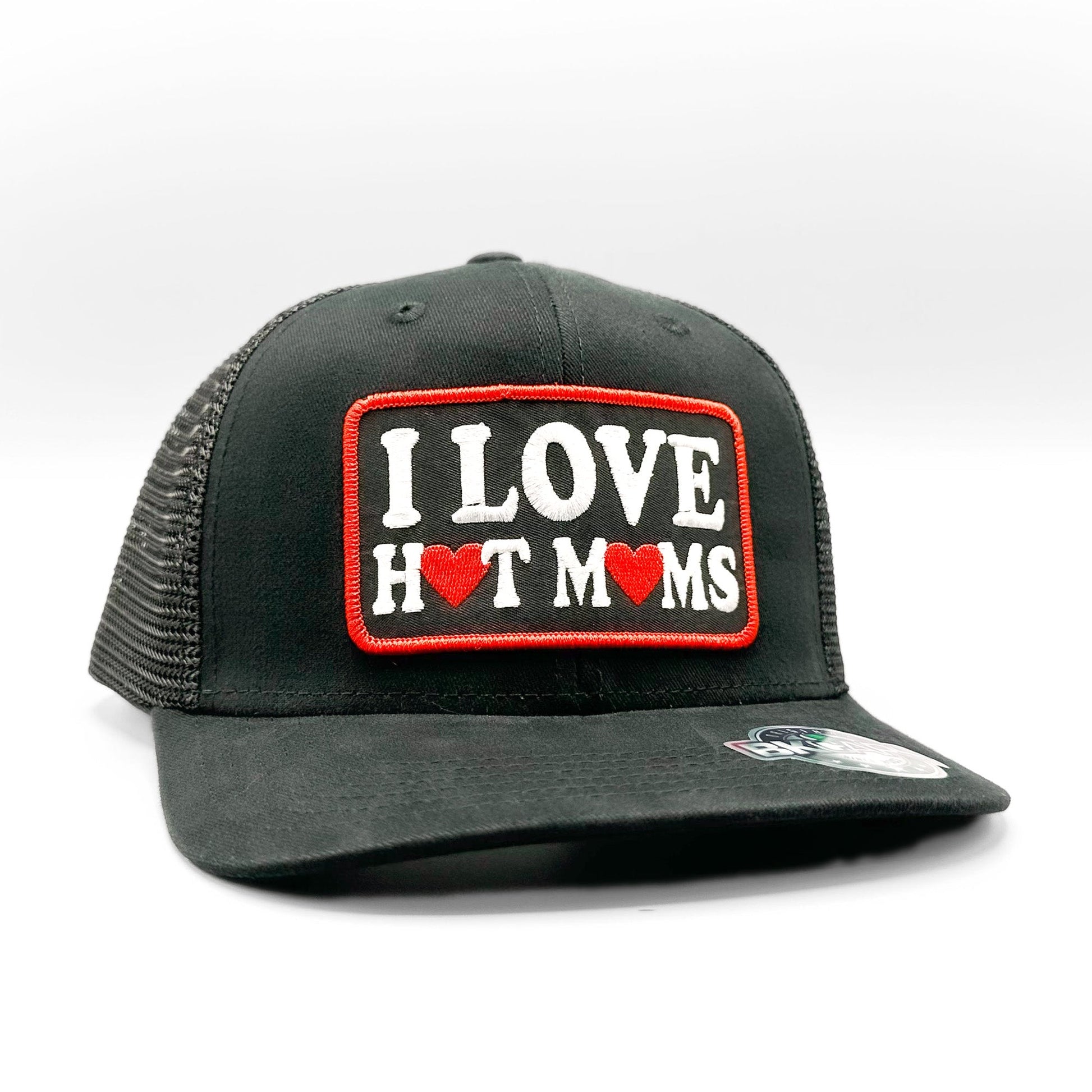 Baseball style black curved bill trucker hat with an embroidered and very funny I Love Hot Moms patch on a BK 5324 mid-crown 6 panel trucker cap. This is a very premium hat and fits very similarly, some say the exact same, as a Richardson 112 hat.