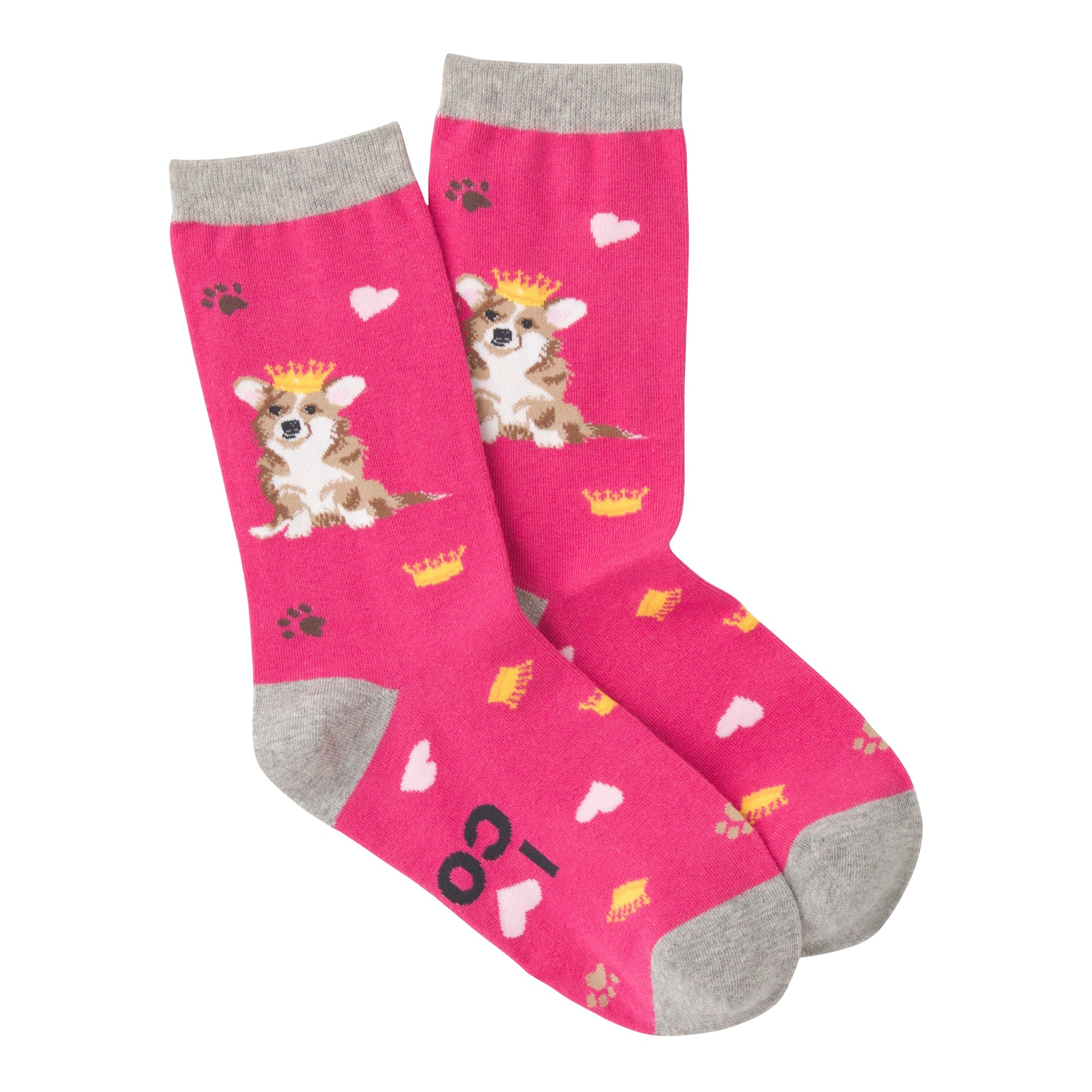 No matter what your style is, this pair of cute socks will make you look absolutely CORG-ious! Each fun pair of these hot pink and gray crew socks features a crown-wearing Corgi with hearts, paw prints, and crowns floating all around. On the bottom of each sock reads “I heart my Corgi”.