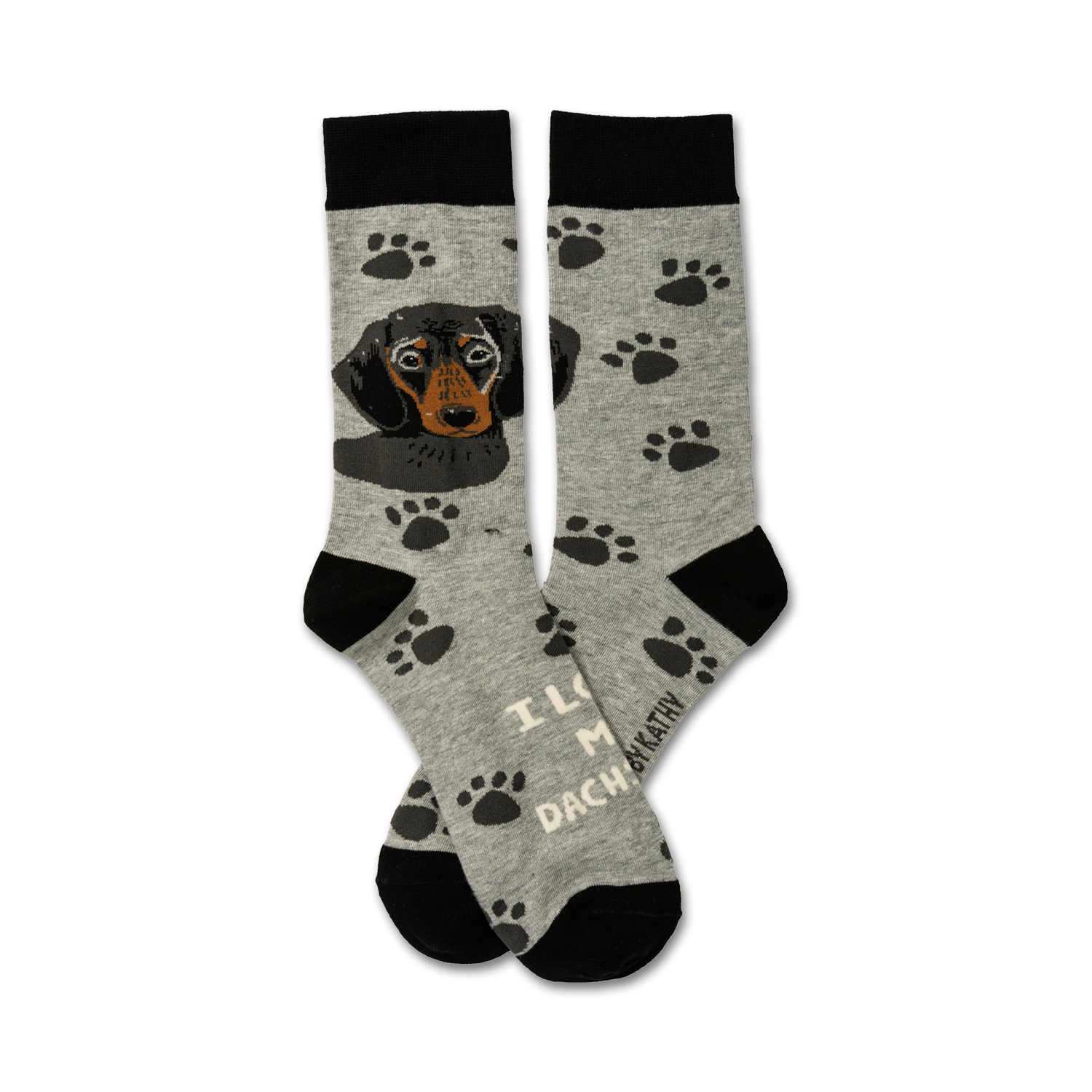 These paw-some gray crew socks feature a black paw print pattern and a lovable dachshund on the front above the words "I Love My Dachshund." Perfect for men and women who adore their furry friends, these socks will add a touch of playful charm to any outfit. Fun fact: Dachshunds are known for their long, muscular bodies and short legs, making them excellent burrowers.
