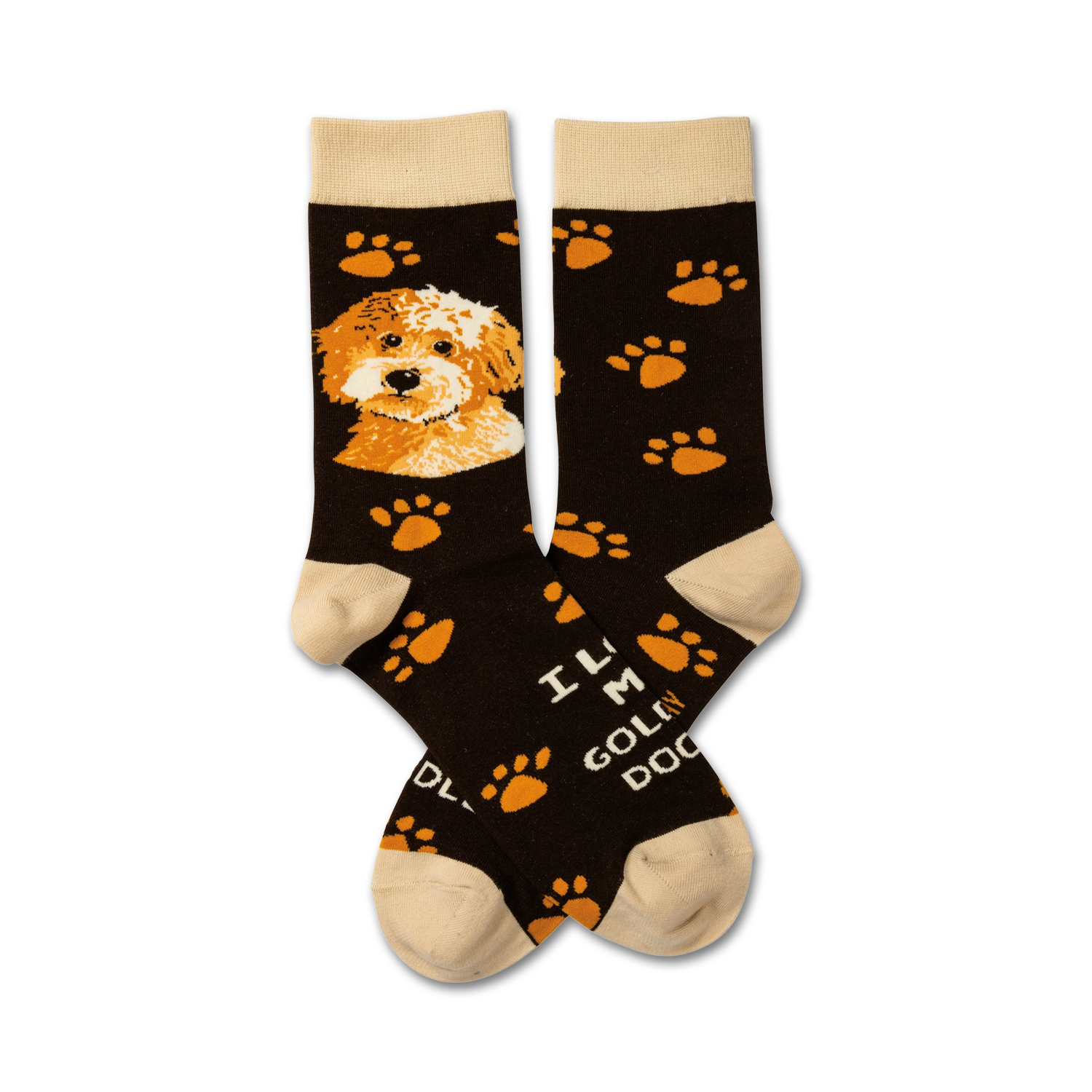 Strut your fluff and celebrate your furry best friend with these I Love My Goldendoodle novelty socks. Featuring a playful pattern of brown paw prints and a heartwarming photo of a Goldendoodle, these socks are the paw-fect way to show off your love for your four-legged companion. Made for both men and women, these socks have cozy cream-colored toes and heels and reach a comfortable crew length. They're an ideal pick for a casual day out or a fun night in with your doodle by your side.