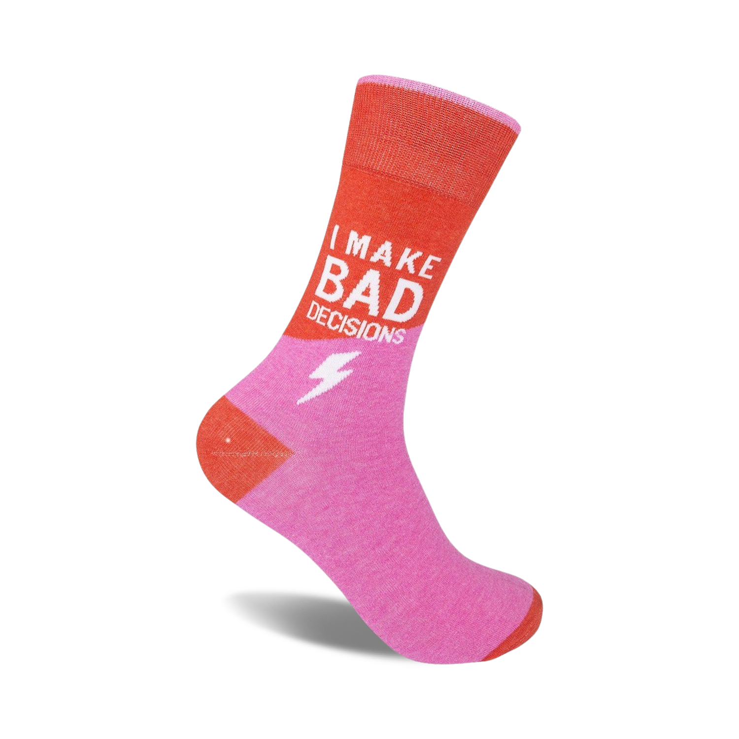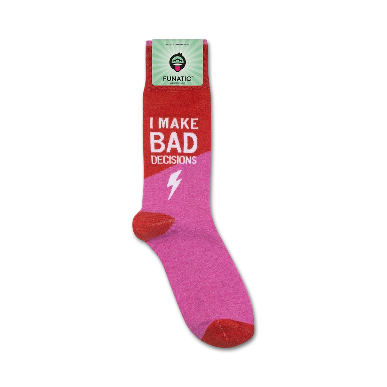 If bad decisions were a sport, you'd be a gold medalist! These I Make Bad Decisions socks are the perfect accessory for anyone who loves to laugh at themselves. The bright pink and red colors are sure to turn heads, and the bold font lets everyone know that you're not afraid to admit your flaws. Whether you're rocking them at a party, a sporting event, or just a casual day out, these socks are sure to get a smile from everyone who sees them. Join the bad decisions club and celebrate your unique style with these hilarious crew socks!