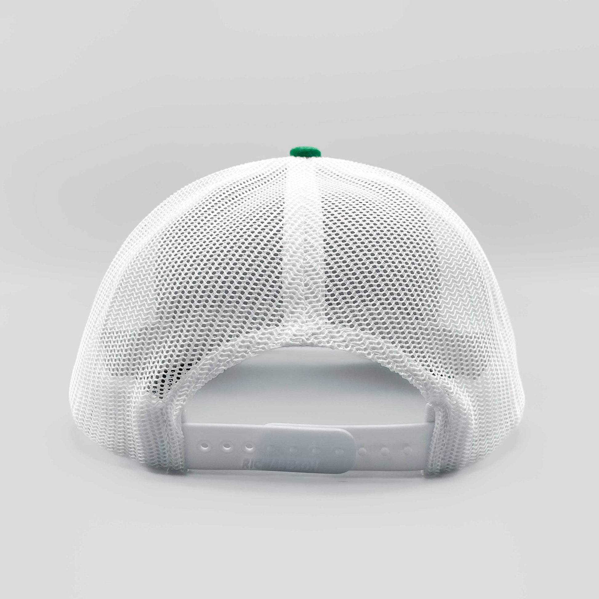 This funny, retro vintage trucker hat features a green front panel and white mesh with a green and white "I Will If You Will." patch on a Richardson 112 mid-crown trucker hat.