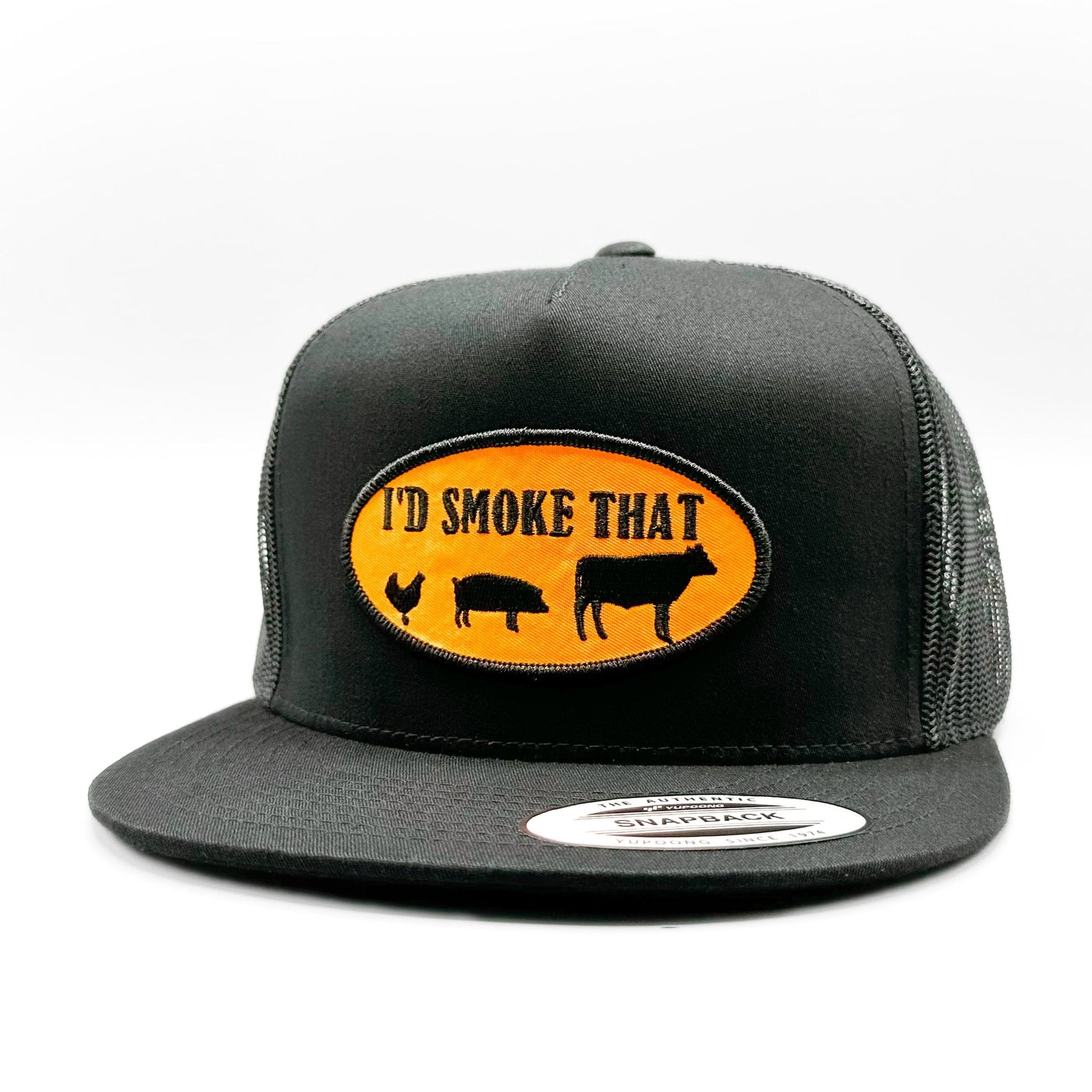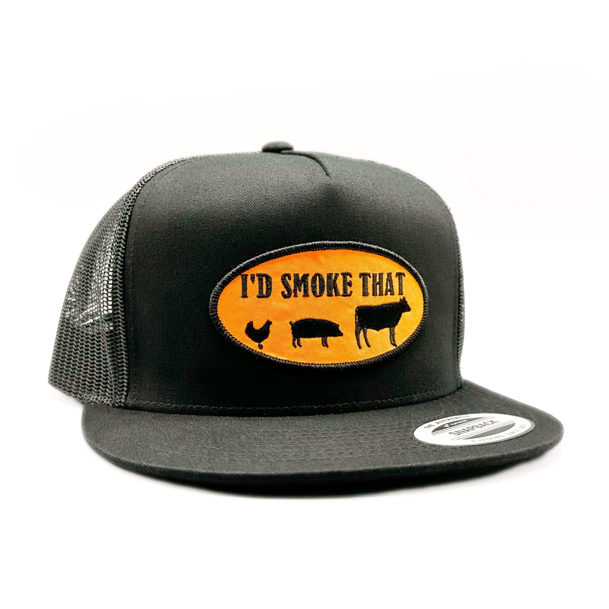This listing is for a funny "I'd Smoke That (Pork, Beef, Chicken) retro embroidered patch on a black Yupoong 6006 Classic mesh snapback trucker hat.