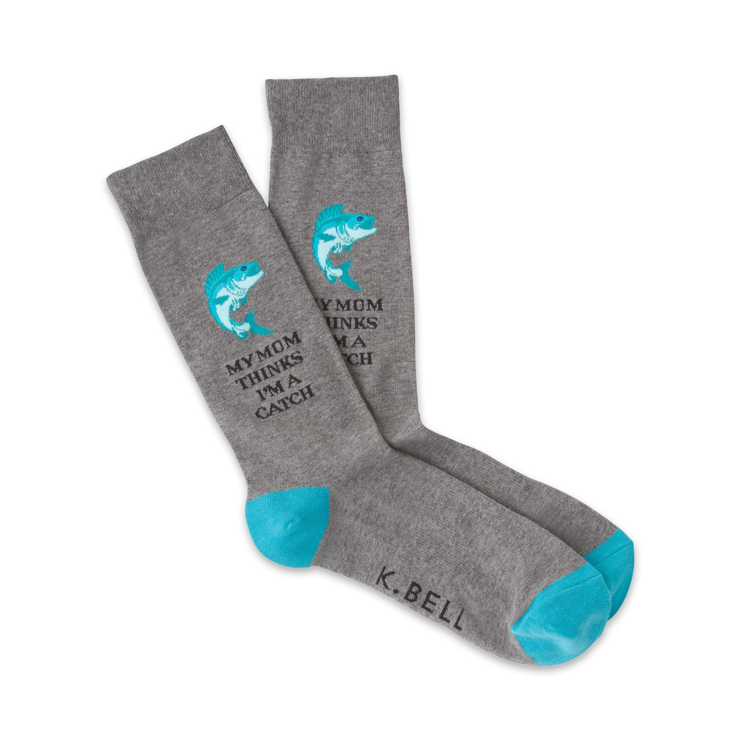 They always say there are plenty of fish in the sea but they never say how hard it is to be one of those fish. This funny pair of gray and blue crew socks features a fish logo with the phrase "My mom thinks I'm a catch" above the ankle. If you can think of a better fish pun, let minnow.