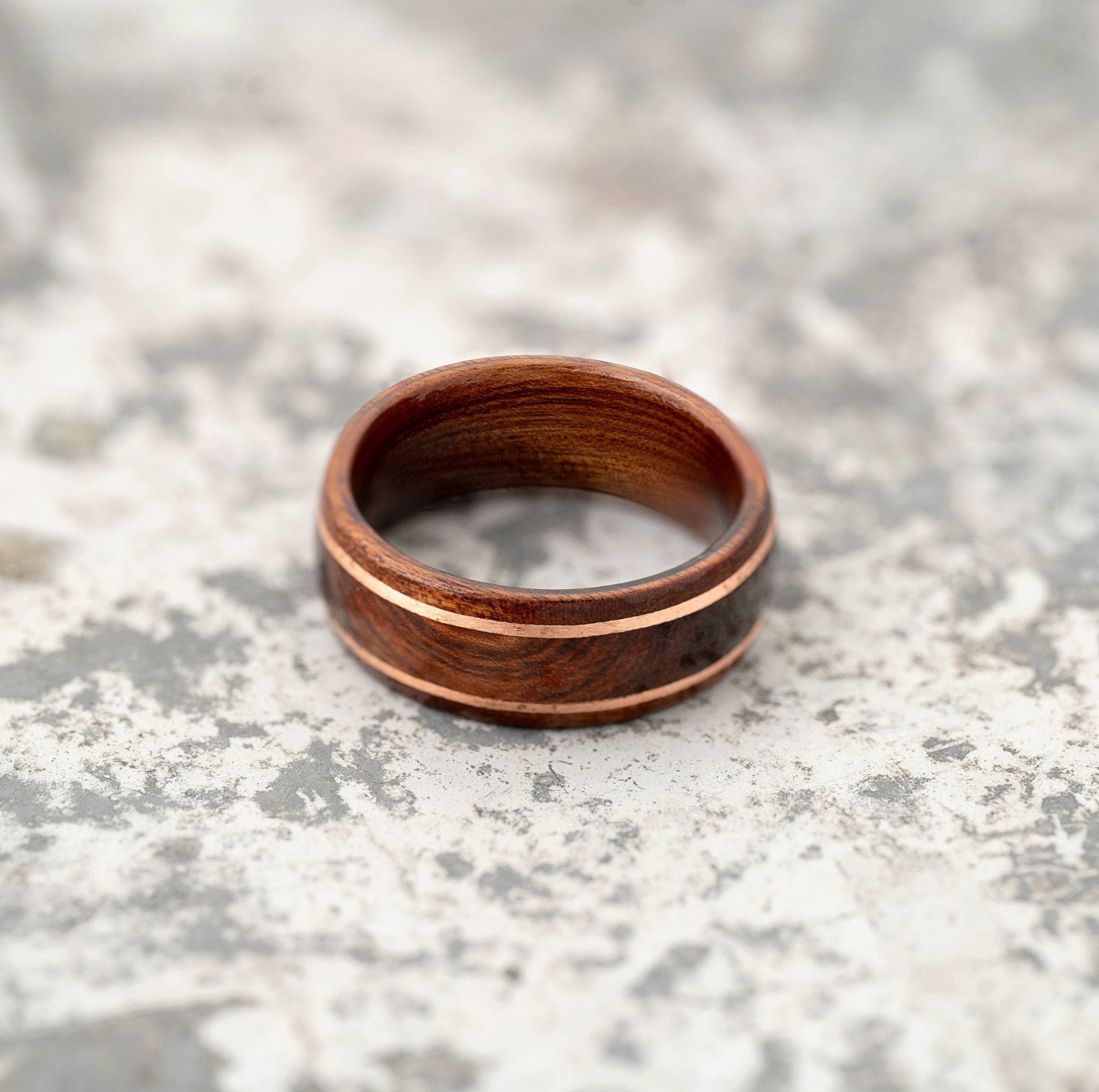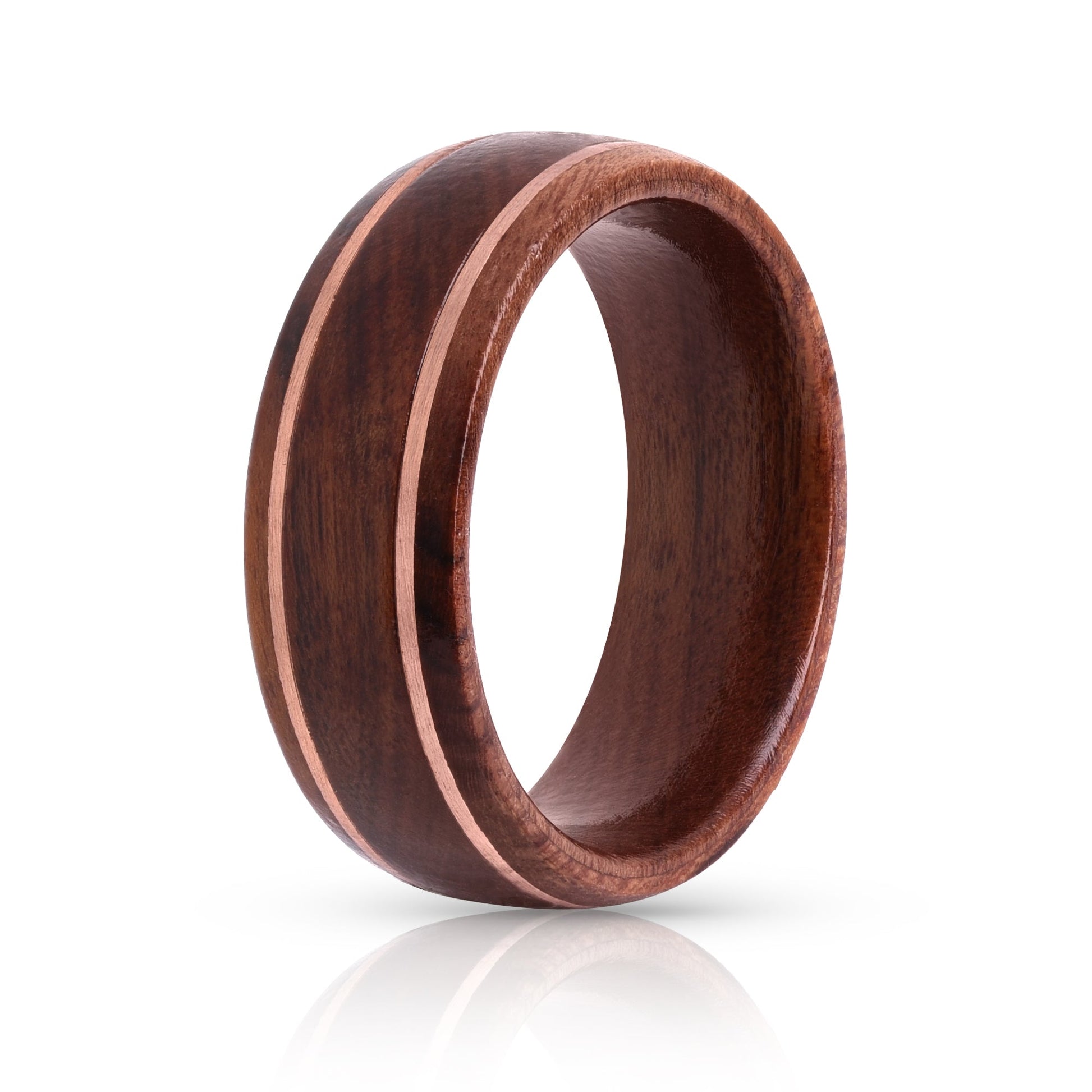 This EMBR band offers stunning color profiles of rich Ironwood with a dual copper inlay around the exterior. Don't be mistaken by its lightweight nature. Ironwood is one of the hardest and most dense timbers in the world, making it the perfect match for our first ever all-wood ring. Since every ring is crafted from this natural wood, each band will have varying color patterns and grains. The dual copper inlay adds a classy touch, creating the perfect combination of manly and sophisticated.
