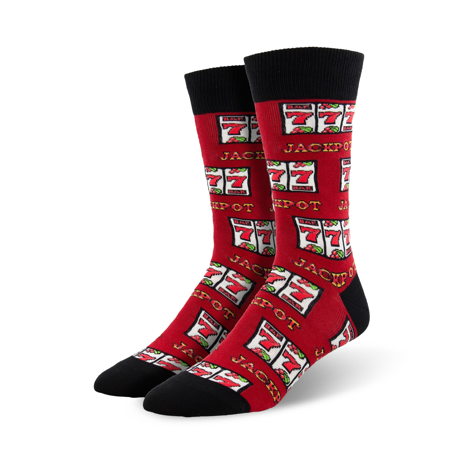 Place your bets, folks! These Jackpot socks will make you feel like you're sitting at a row of Vegas slot machines. These crew length men's socks feature a bold red color and a pattern of cartoonish slot machines with cherries, lemons, and bells, all topped off with the word JACKPOT. These socks are sure to win over anyone who sees them. Guaranteed to be the star of any sock drawer; wear them at the casino, the office, or just around the house for a touch of luck!