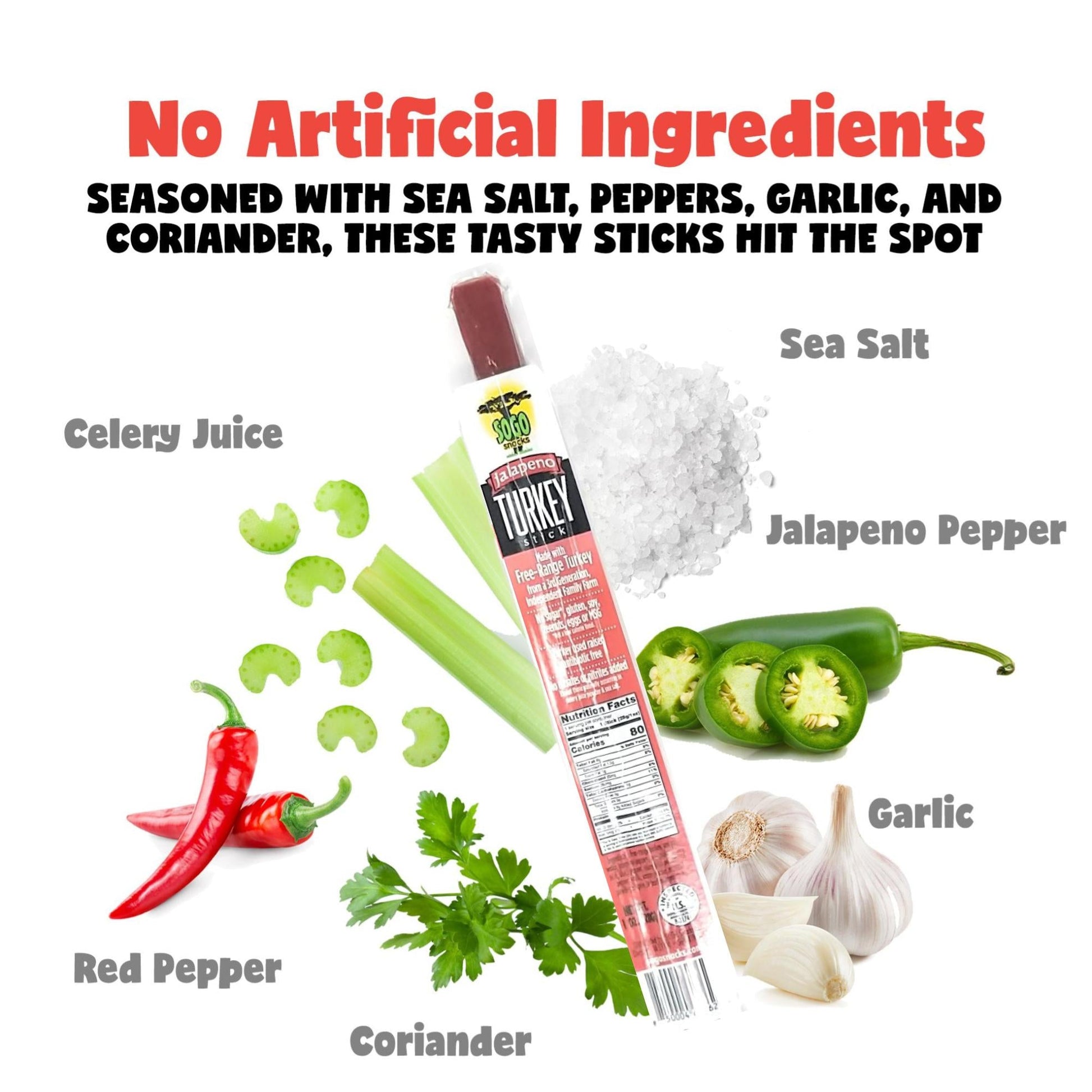 Turkey Jalapeño Ingredients: 100% free-range turkey, sea salt, water, jalapeño peppers, encapsulated citric acid, black pepper, celery juice powder, red pepper, garlic, onion powder, mustard powder, allspice, in beef collagen casing.