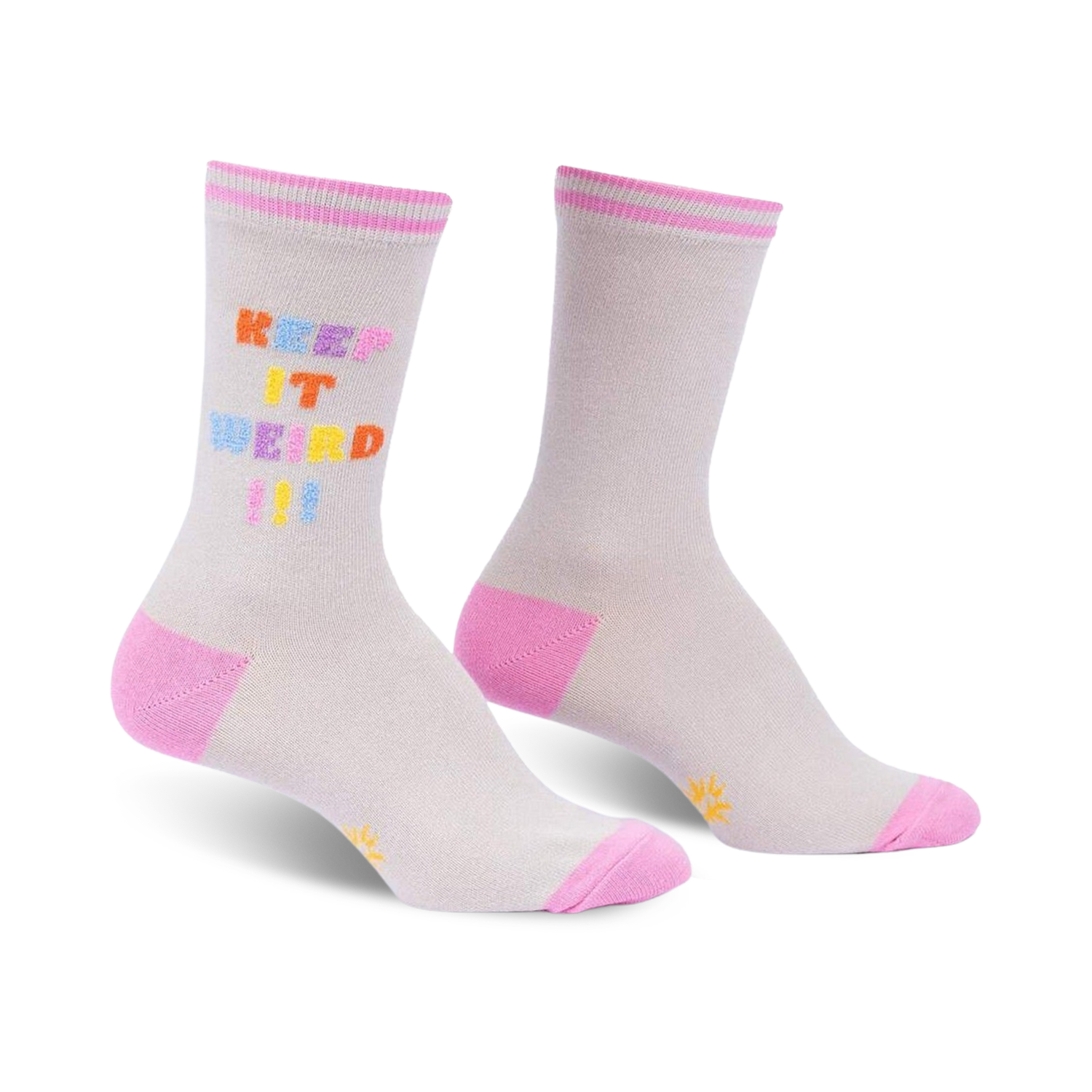 Crew length, these 'Keep It Weird!' socks in white will brighten up any day. Just look at those rainbow-colored letters on the left sock and the pink heel and toe adorned with a little sun graphic on the right. Whether you're rocking them with sneakers, boots, or sandals, they'll add a pop of color and personality to your look. Socks with attitude that live by the mantra, 'Keep It Weird!', they'll inspire anyone to embrace their unique quirks and shine bright. And remember, weird is wonderful!