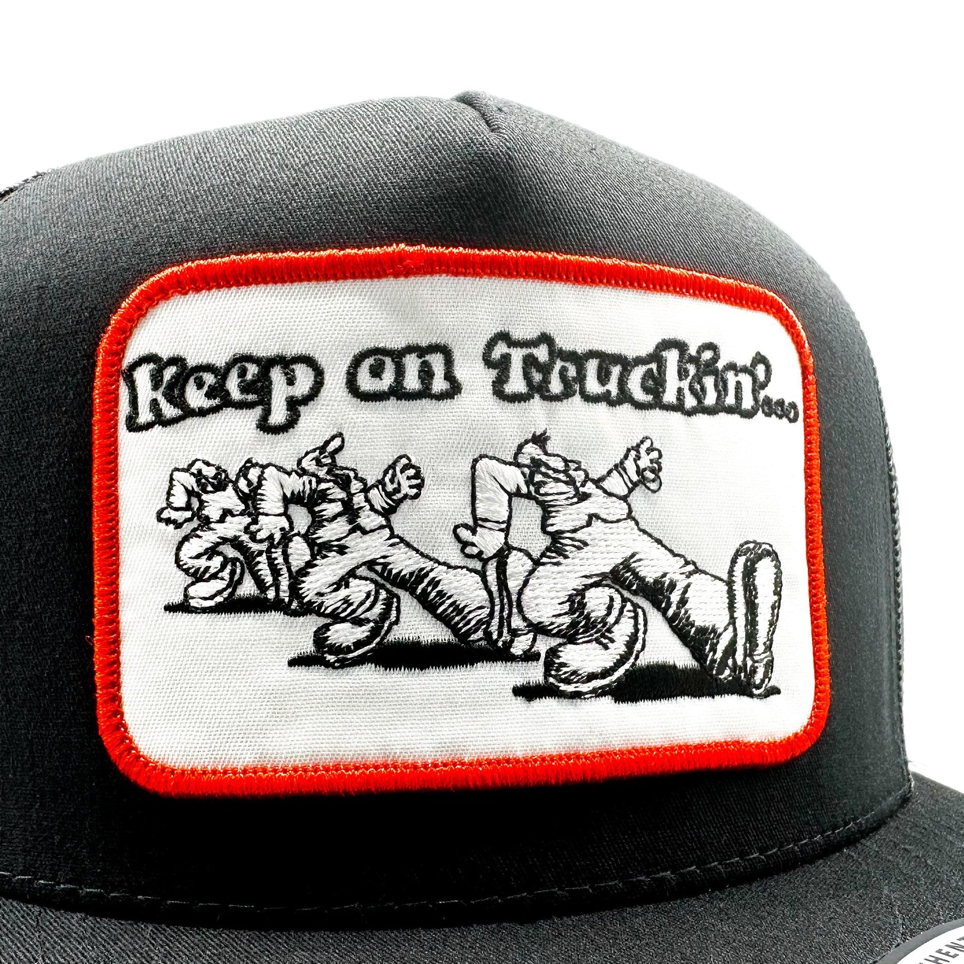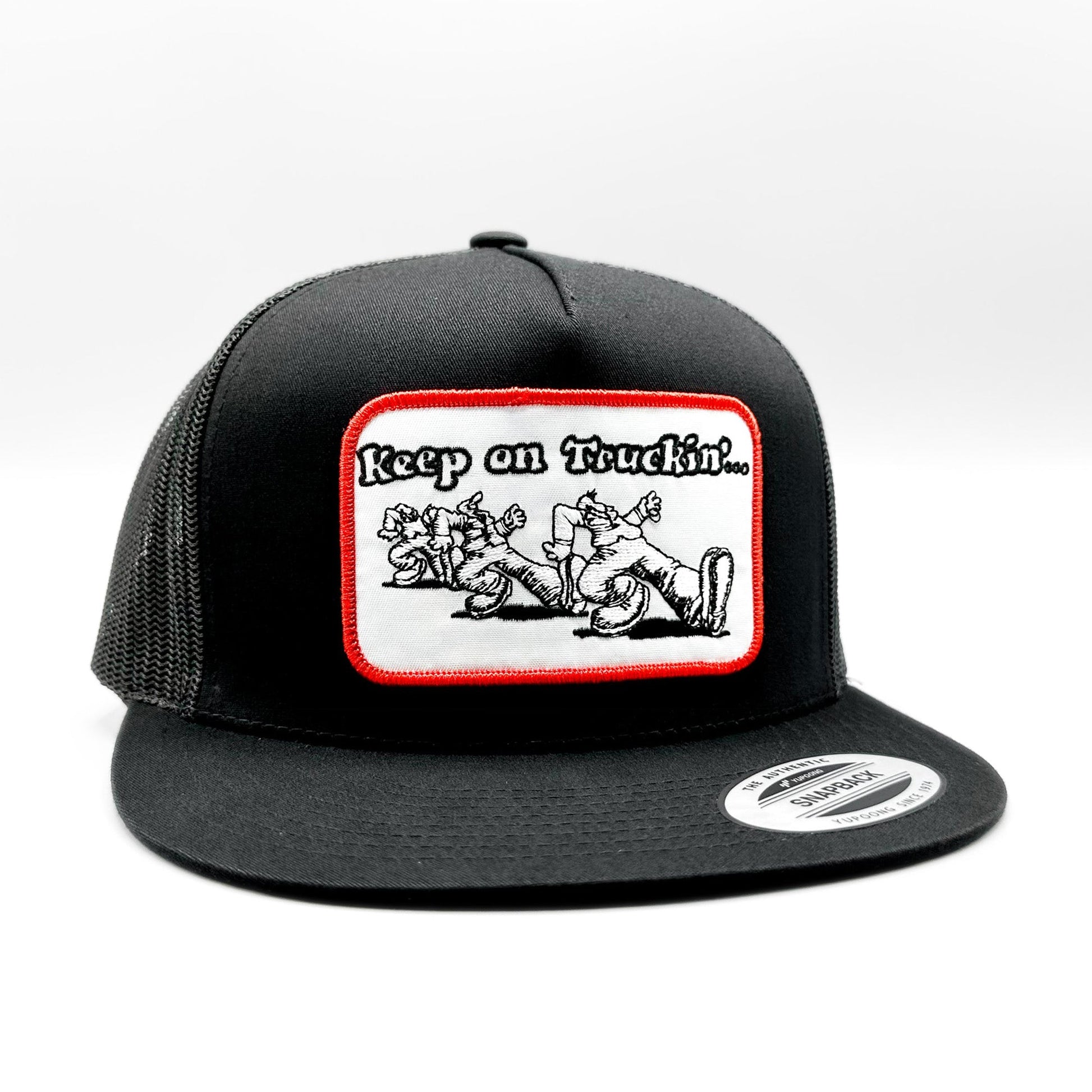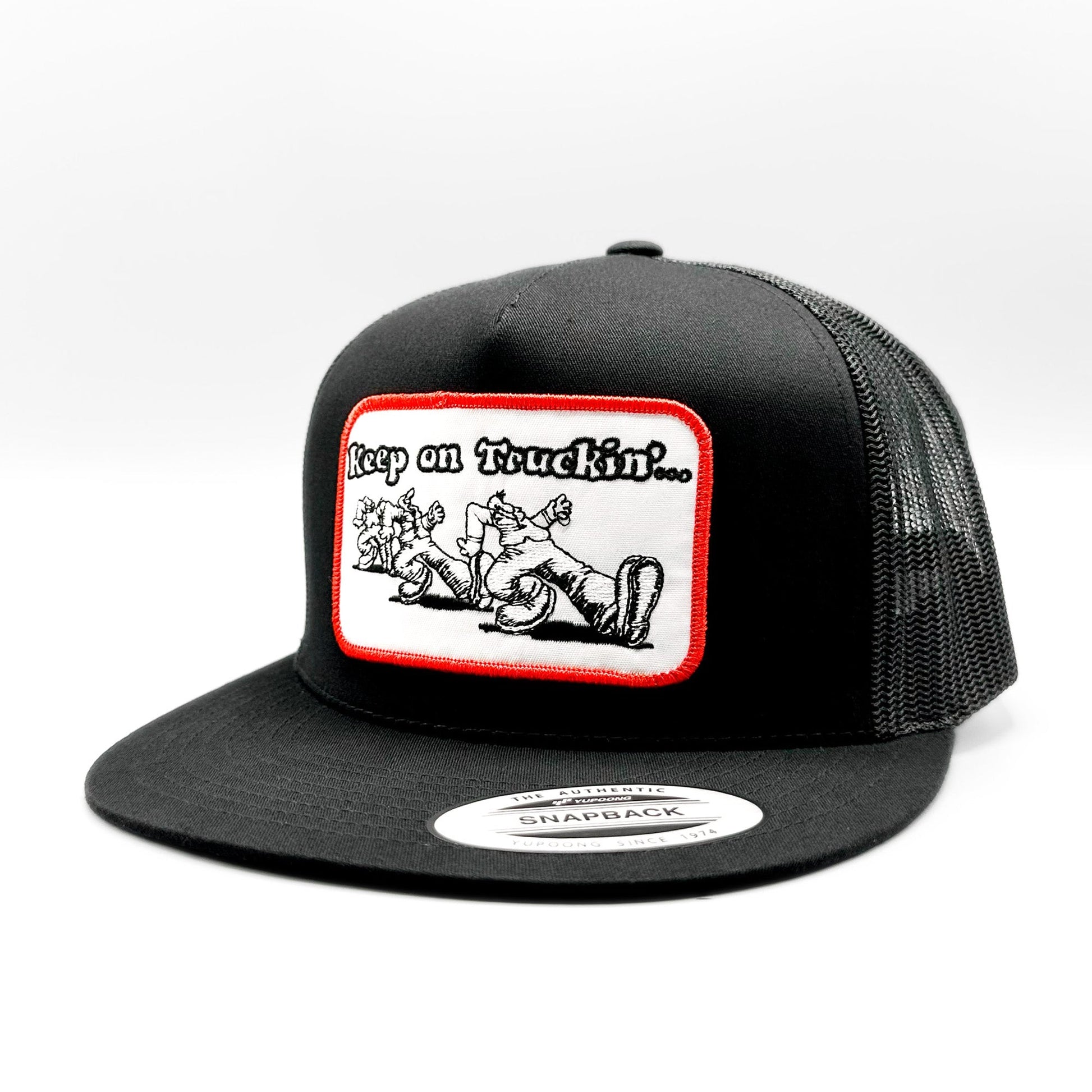 This listing is for a retro style "Keep on Truckin'" embroidered patch on a black Yupoong 6006 Classic mesh snapback trucker hat.
