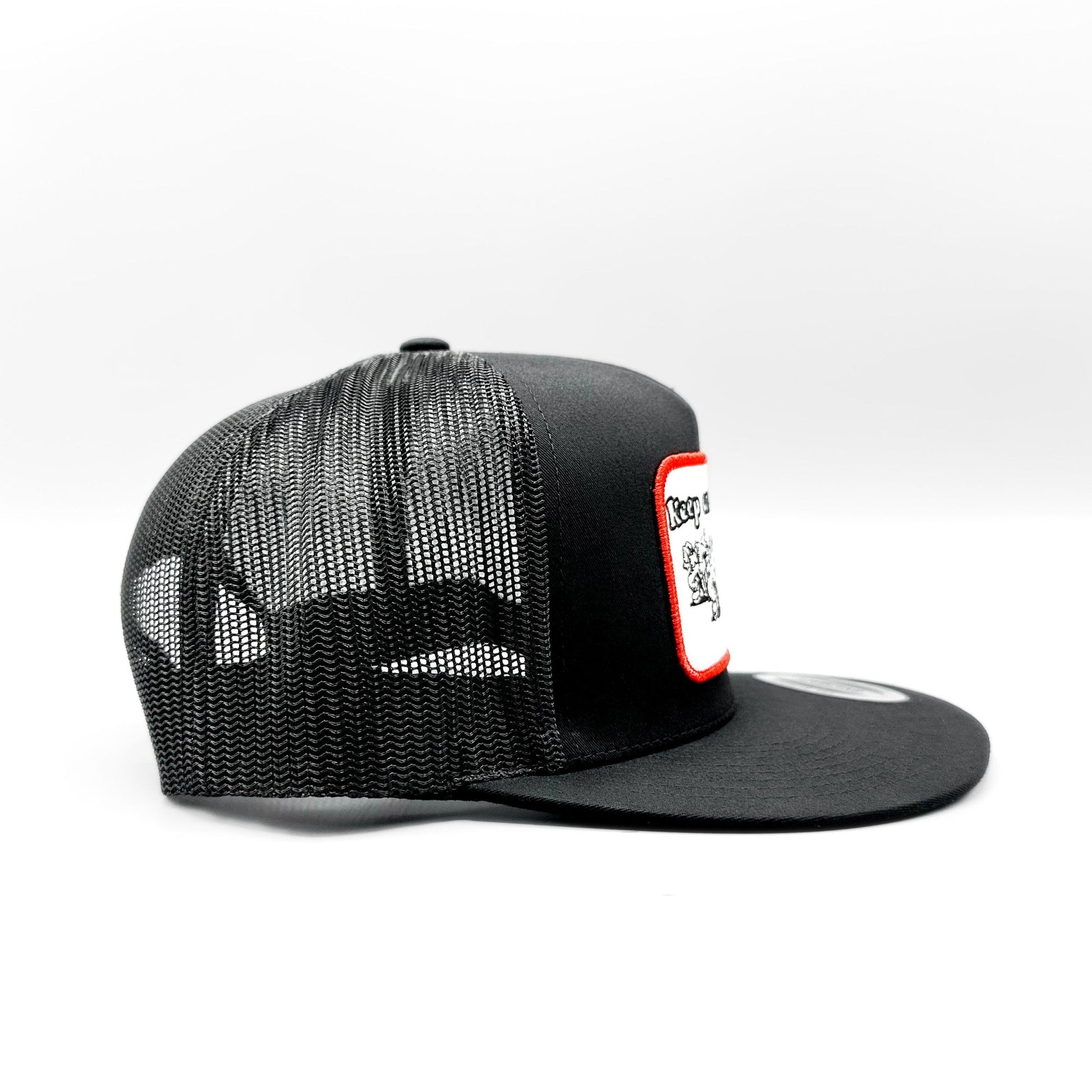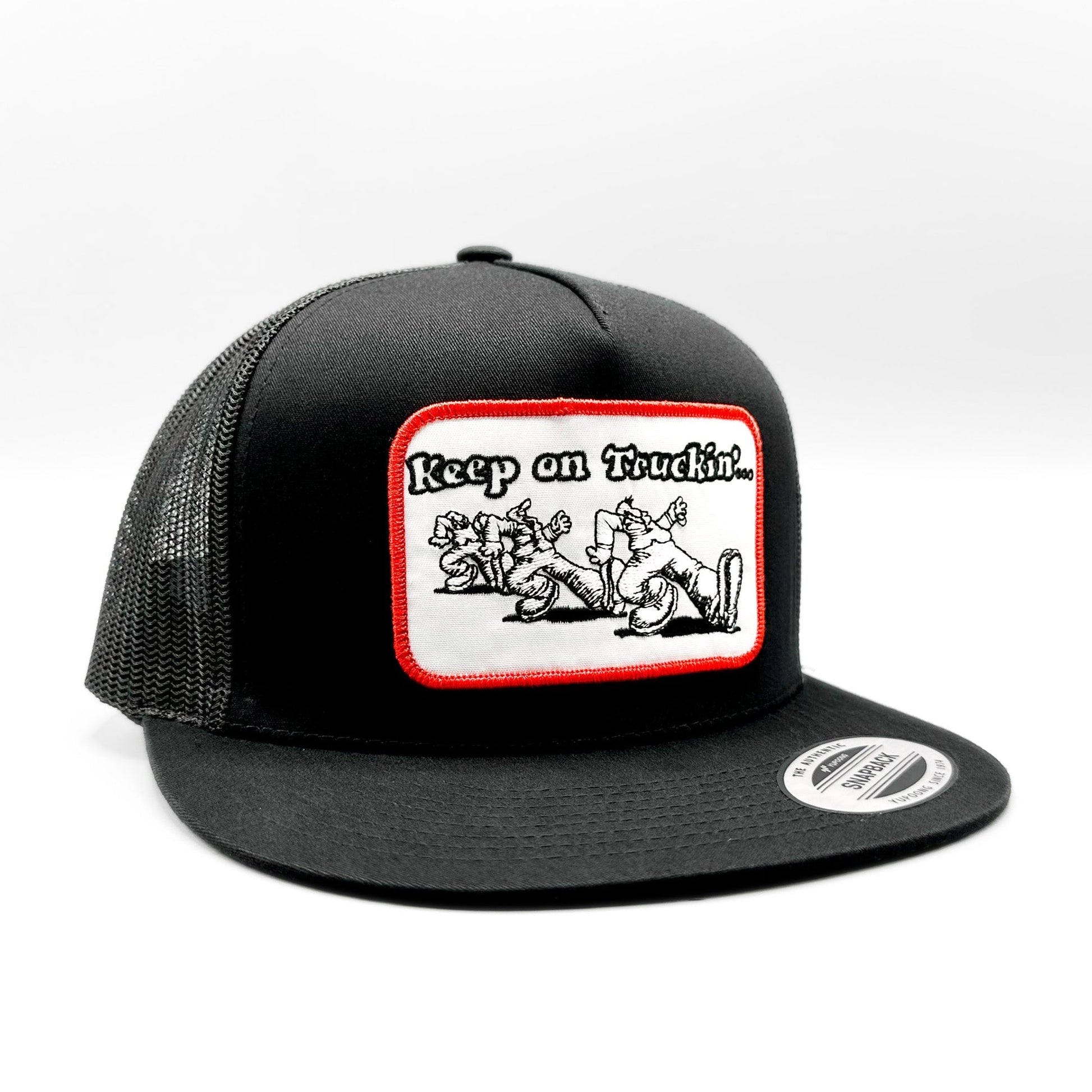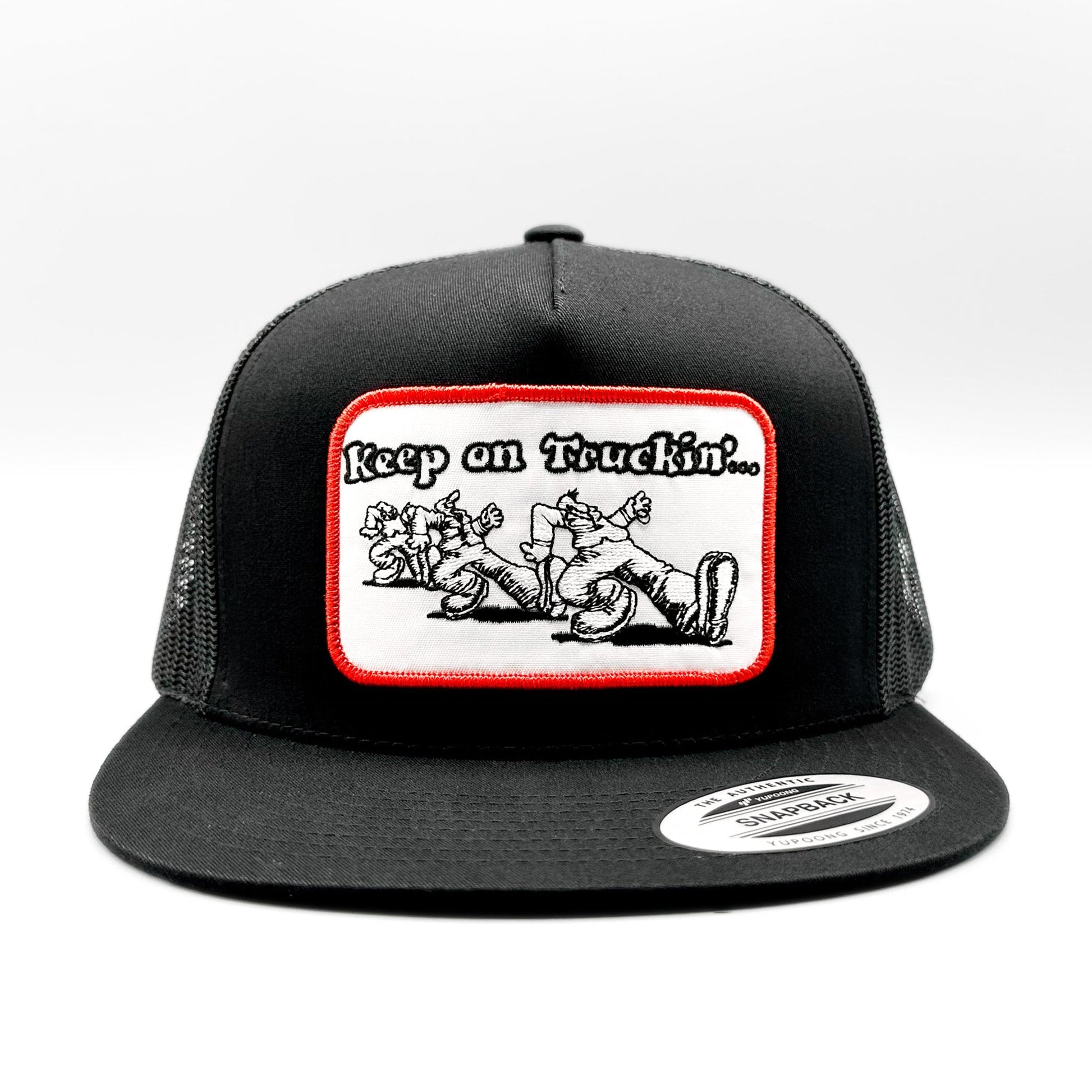 This listing is for a retro style "Keep on Truckin'" embroidered patch on a black Yupoong 6006 Classic mesh snapback trucker hat.