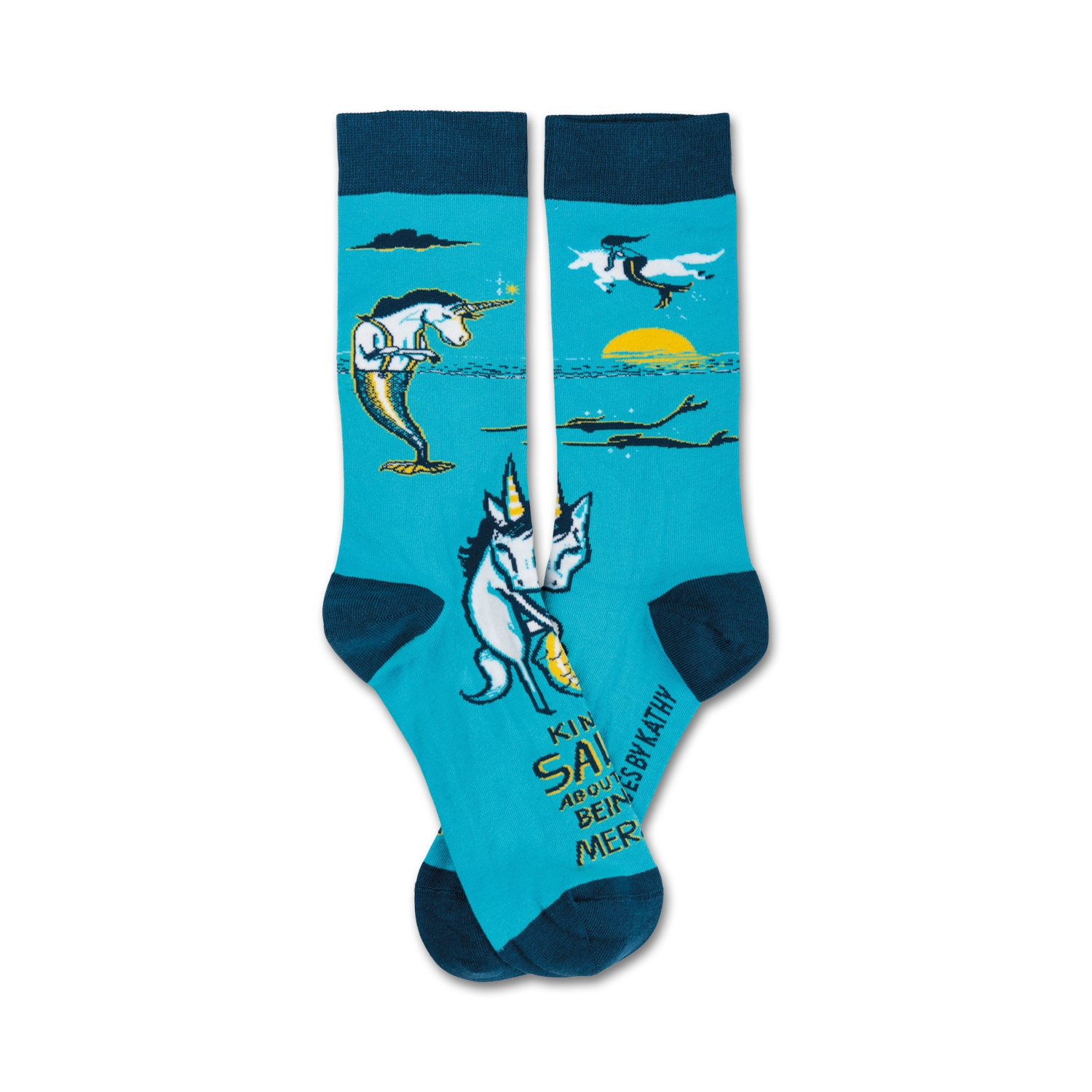 Get ready to dive into a magical underwater world with our Kinda' Salty crew socks! Featuring a captivating pattern of unicorns and mermaids frolicking in the ocean, these socks will turn your feet into a mythical wonderland. With the words "Kinda Pissed About Not Being a Mermaid" playfully adorning the socks, you can express your inner mermaid dreams with a touch of humor. And hey, who knows, maybe wearing these socks will grant you the magical powers of a mermaid worth a try, right? Slip into these socks and let your imagination set sail!