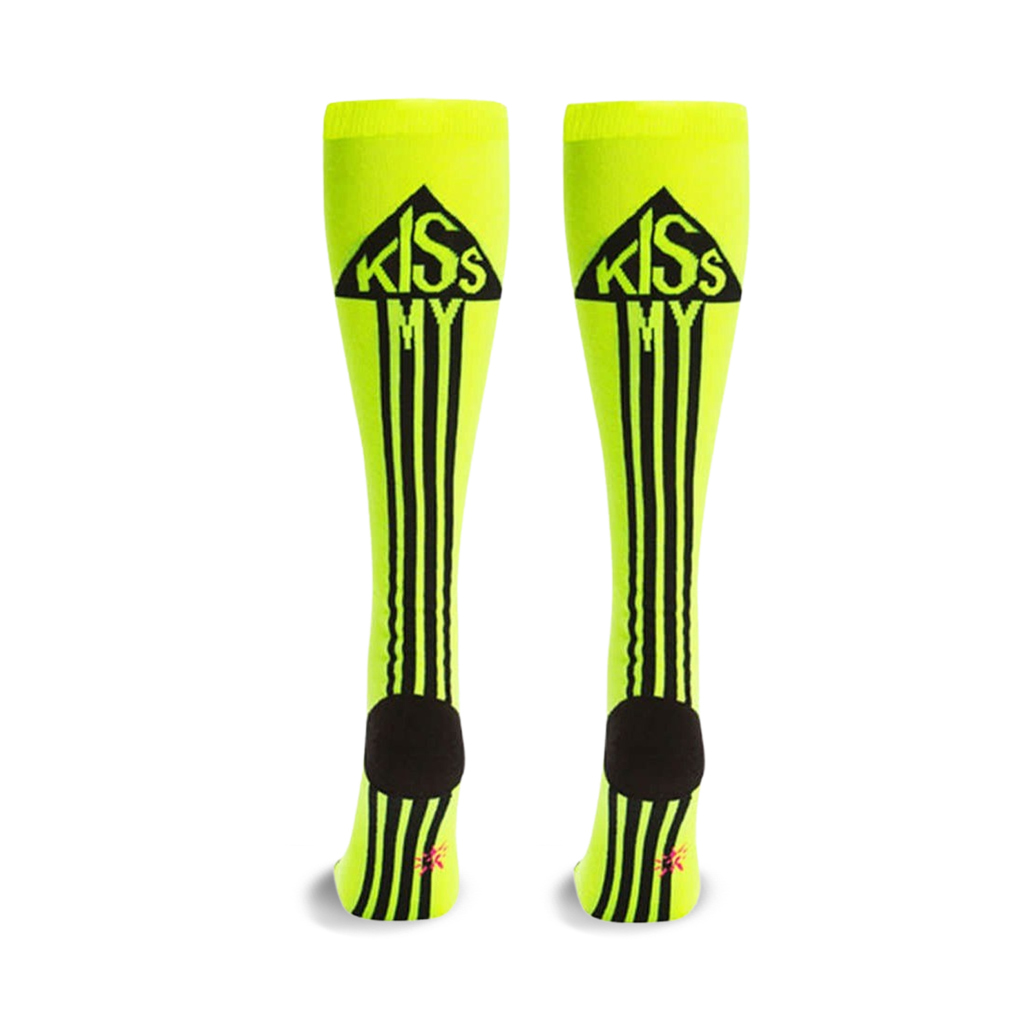 Make a bold statement with anyone who trails behind you. Let them know to pucker up and just where to put their lips! These funny, cool knee high socks come in a bright neon green with bold black arrows pointing up on the backs of the calves. Pucker up buttercup!