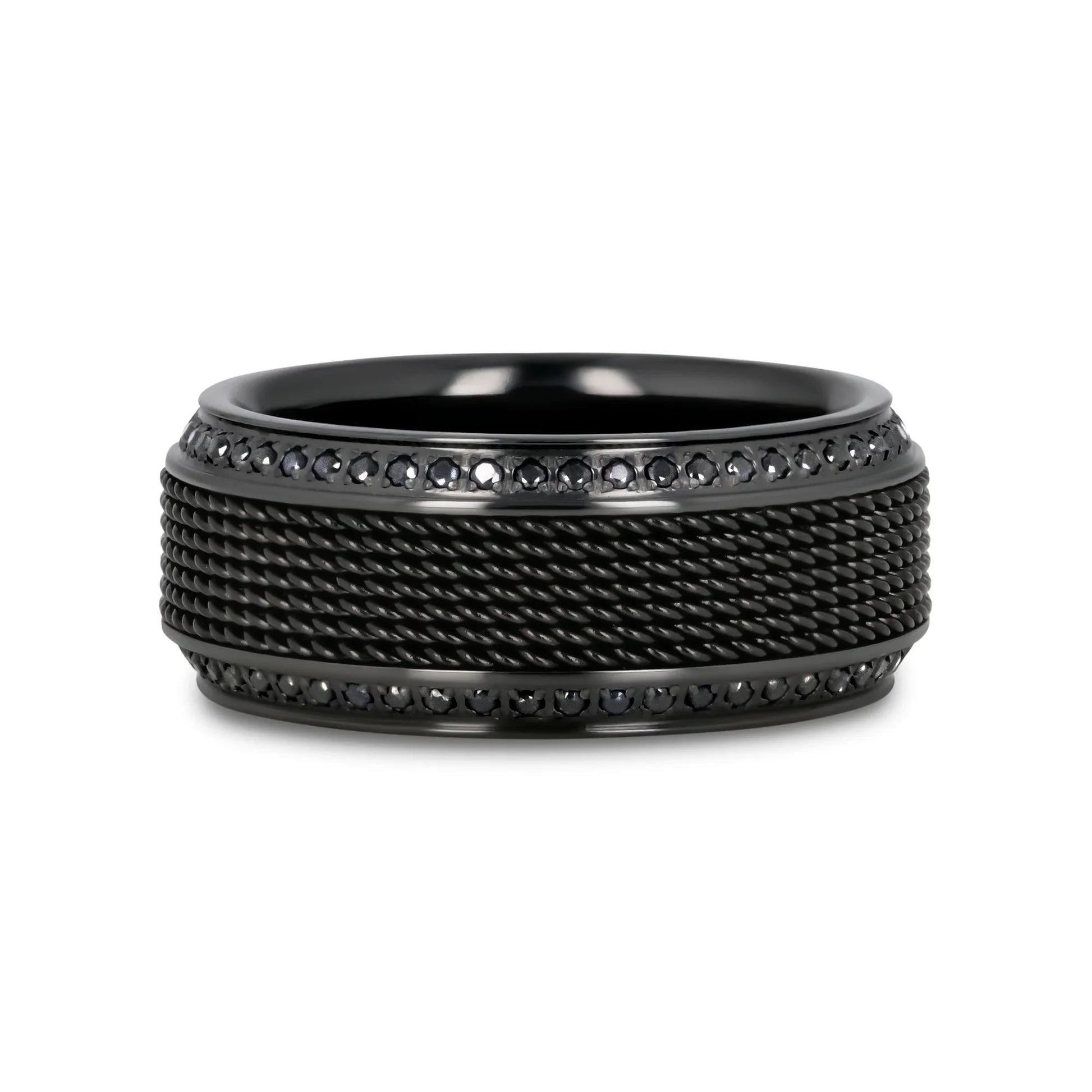 KNIGHT Steel Chain Black Titanium Wedding Ring Polished Beveled Edges Set with Round Black Diamonds - 10mm
