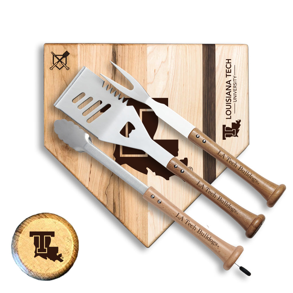 - Includes: "Slider" Spatula, "Forkball" Fork, "Splitfinger" Tongs, and "Home Plate" Cutting Board.