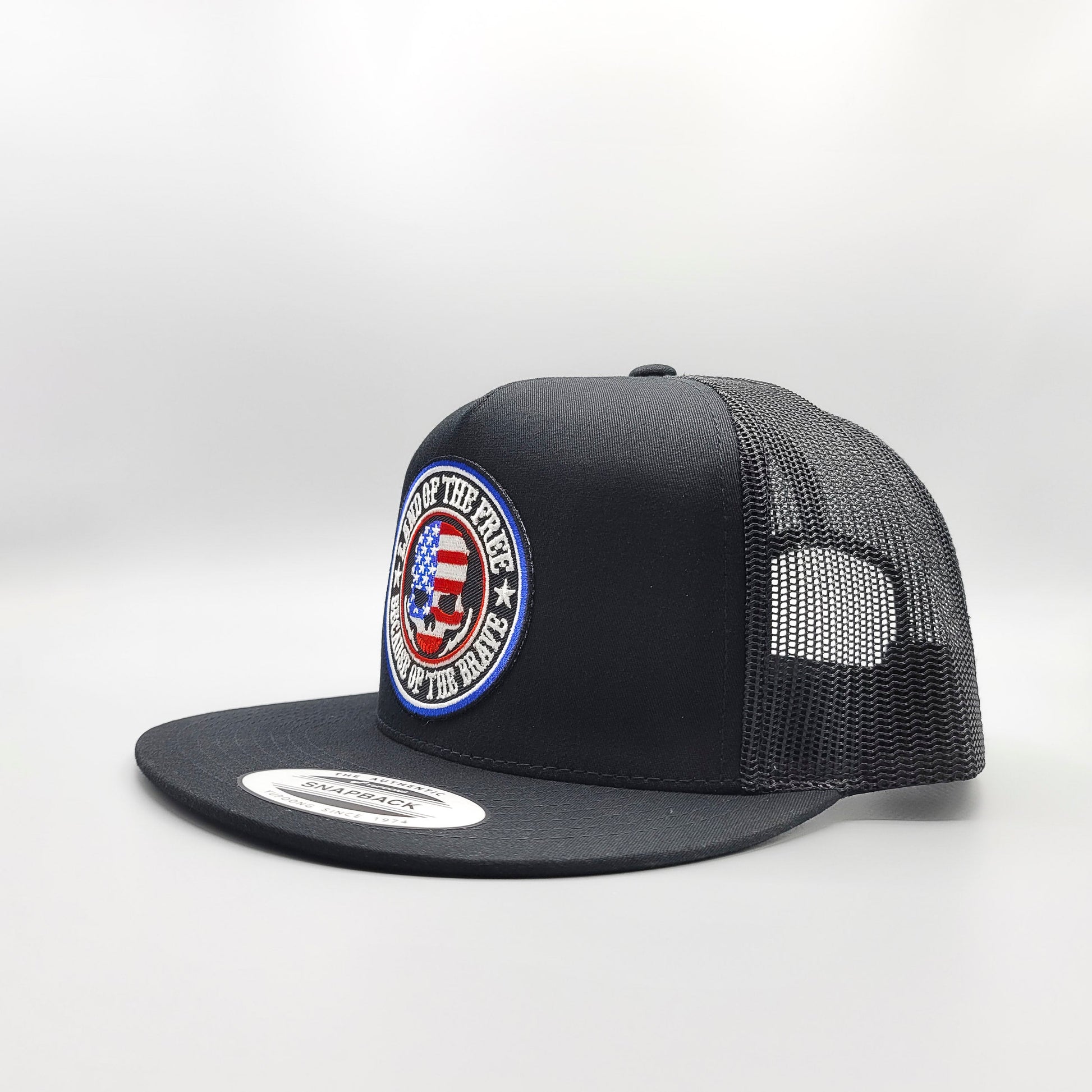 This vintage style patch is applied to one of our best selling trucker hats -- a Yupoong 6006 Flat Bill Snapback Classic Trucker Hat. Get that great flat bill look in a high-crown cap with a cool patriotic flat bill mesh baseball cap.